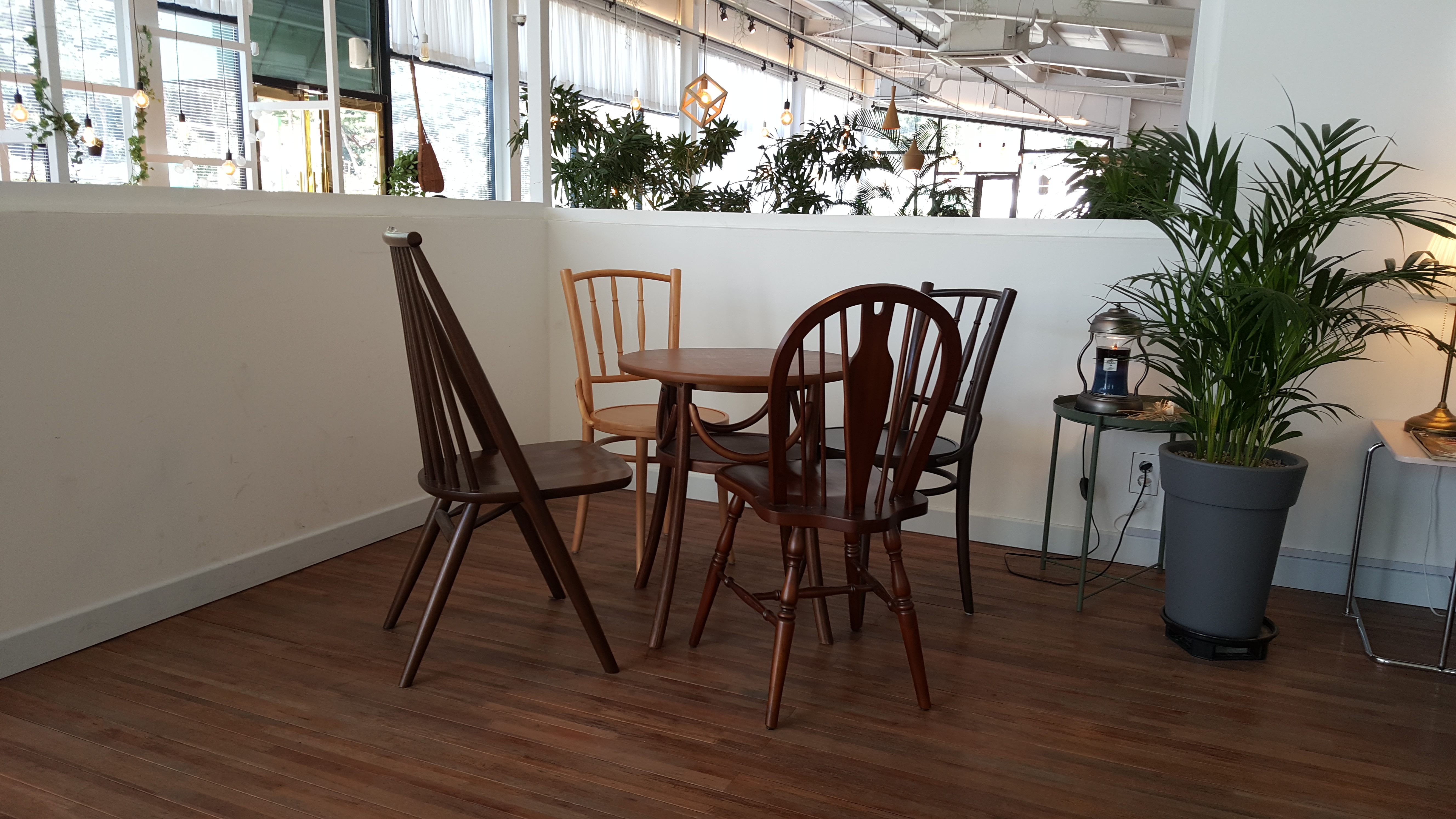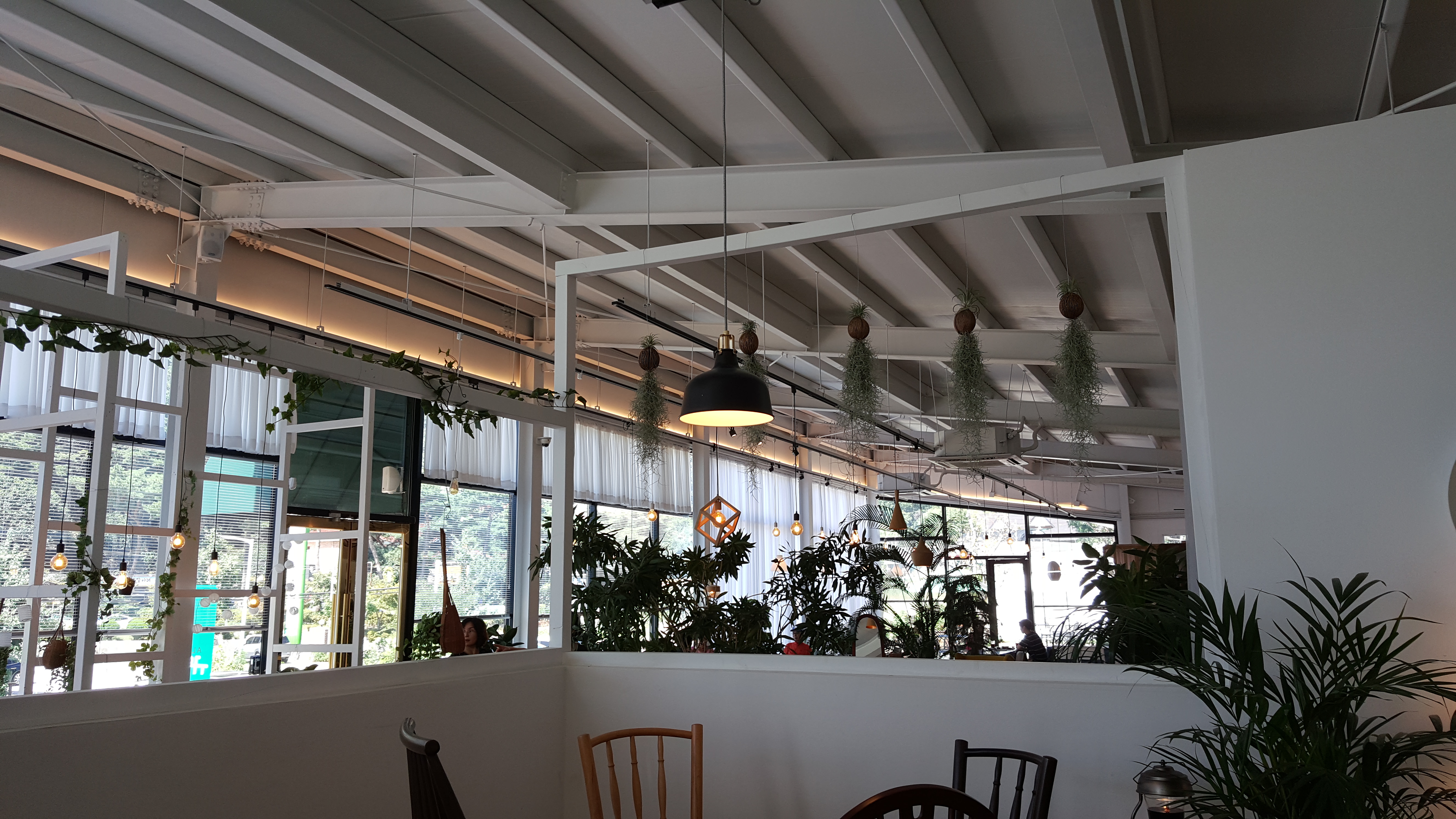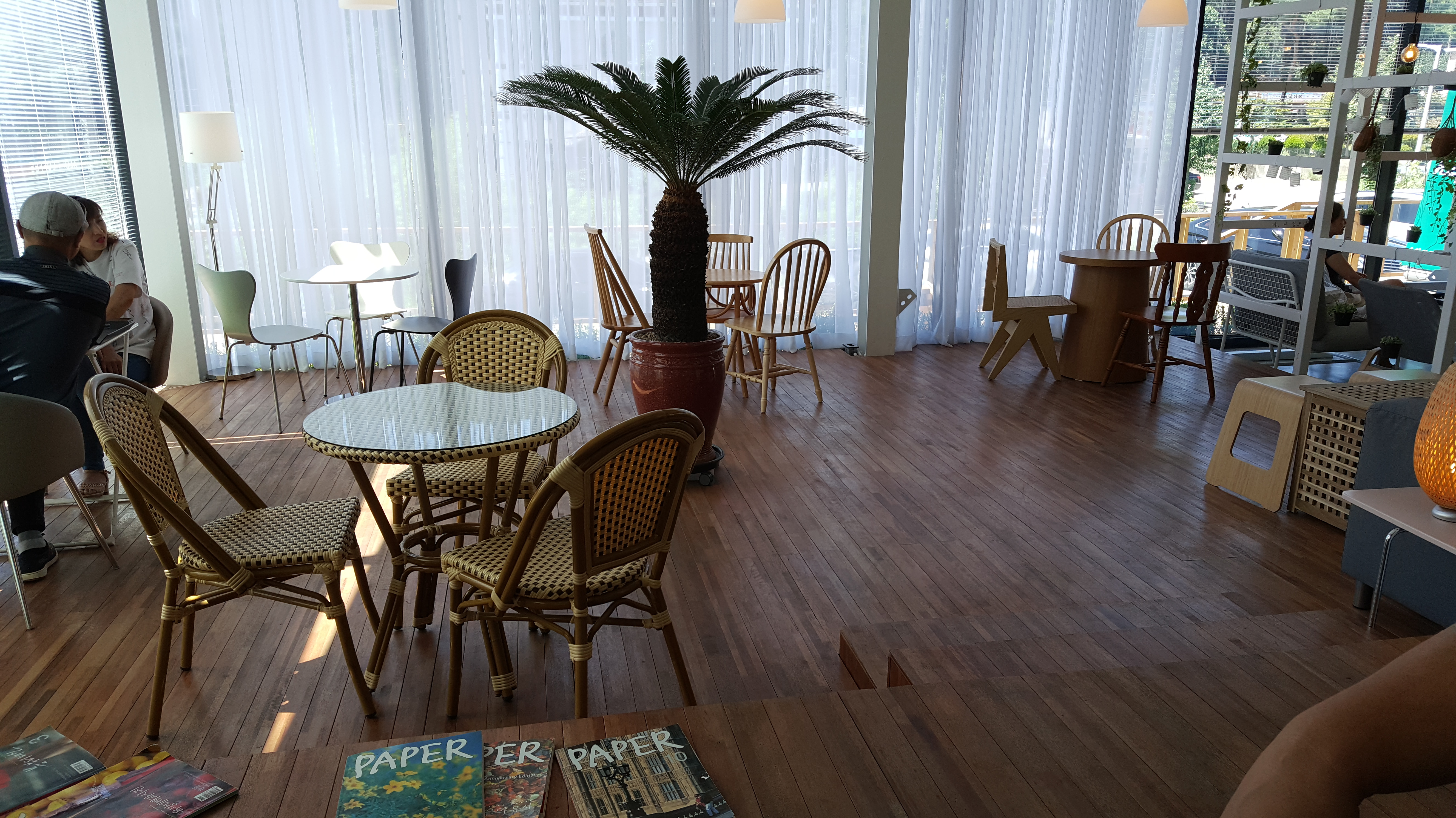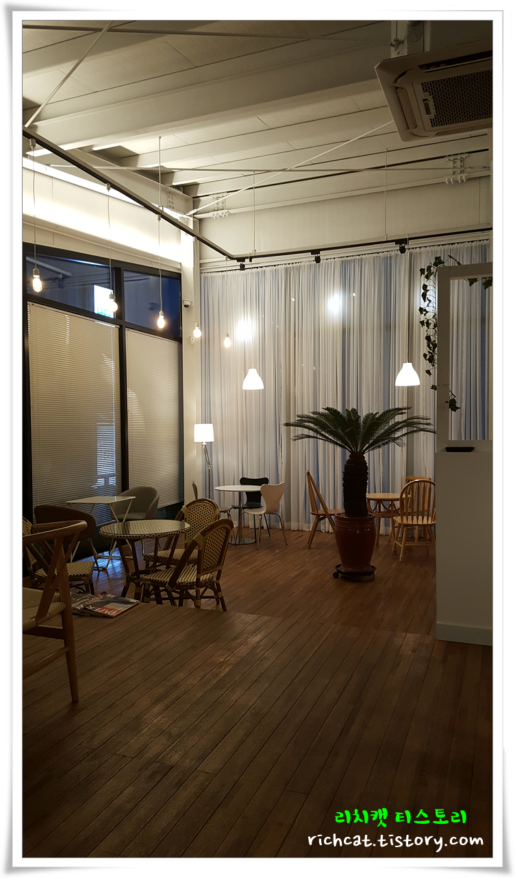 큰 비용 들인 것 같지 않지만...다양한 위치와 형태의 의자외 탁자들로 조화를 이룬 카페테리아.