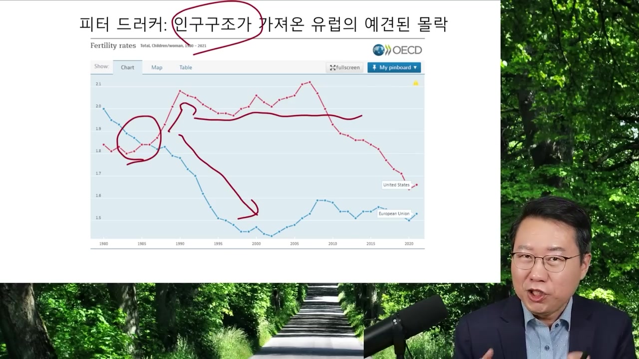 드러커는 유럽의 인구 구조로 인한 몰락을 예언했는데, 고령화로 인한 유럽의 출산율 하락이 경제와 몰락에 영향을 미칠 것이라 주장했어요.