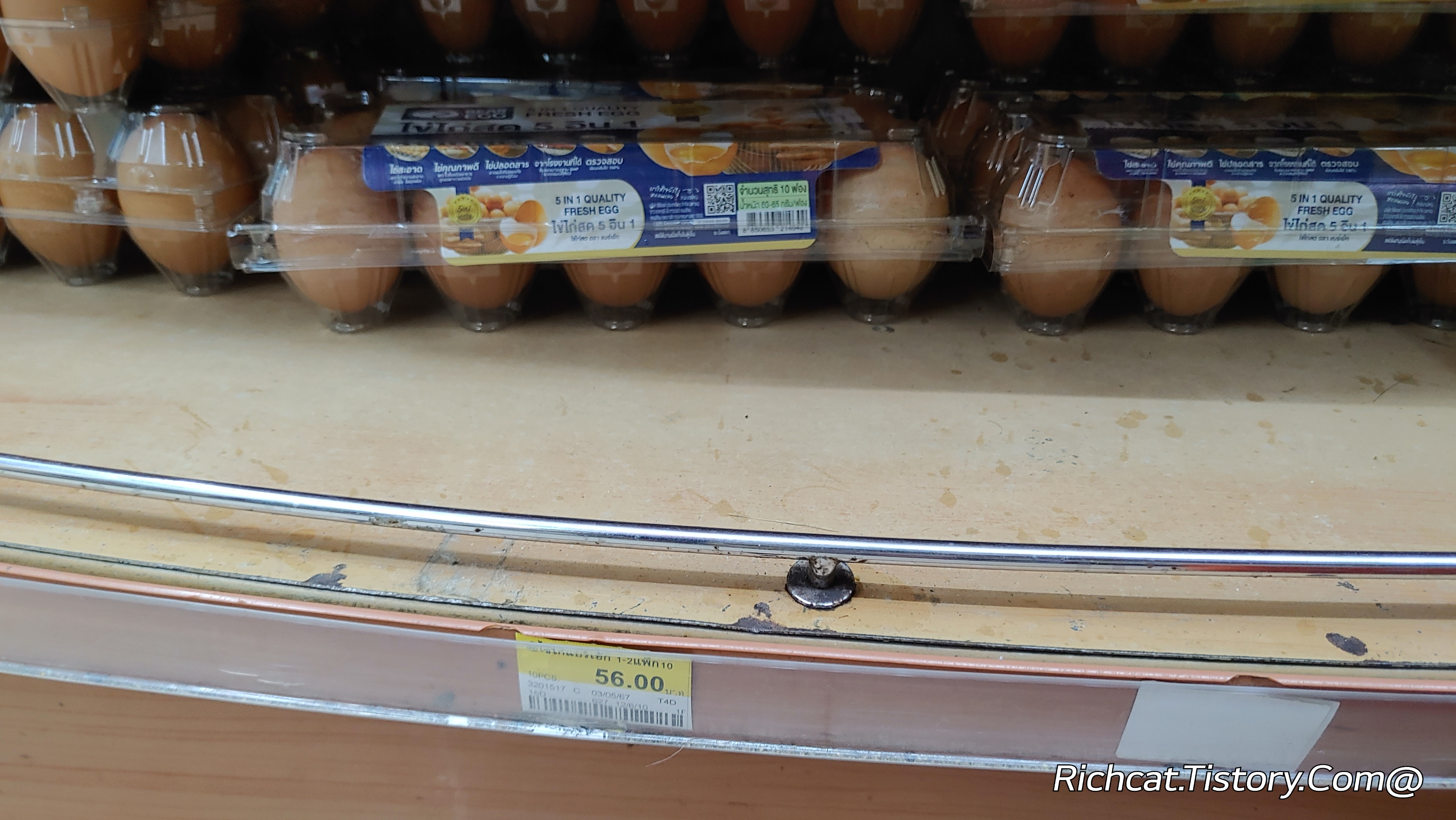 태국의 가장 대표적인 유통 채널인 세븐일레븐에서 달걀 10개 한 팩에 56 바트 또는 63바트이다