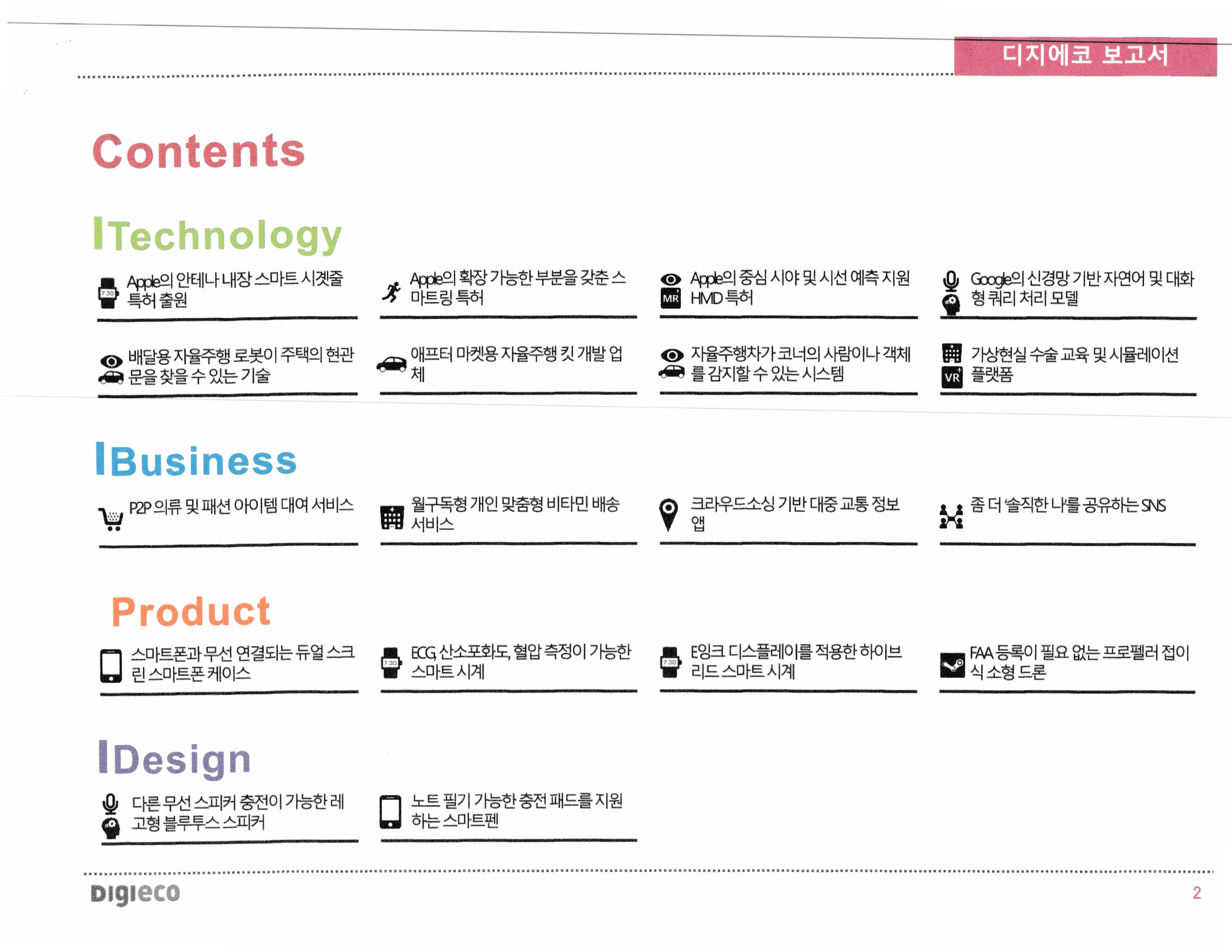 애플 안테나 시계줄, 애플 스마트링, 애플 HMD, 구글 신경망 기반 자연어, 가상현실 수술교육, p2p 의류-패션 아이템 대여서비스, 월구독형 비타민 배송서비스, 솔직한 나를 공유하는 sns,