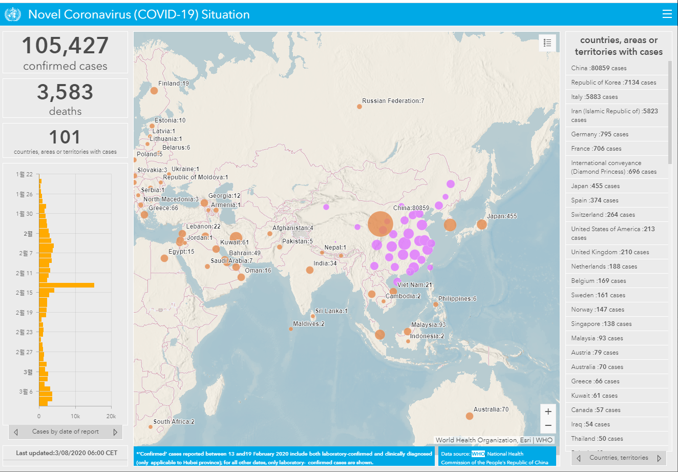 현재 전 세계적으로 총 95,265 건의 COVID-19 사례가보고되었으며 3281 명이 사망했습니다.