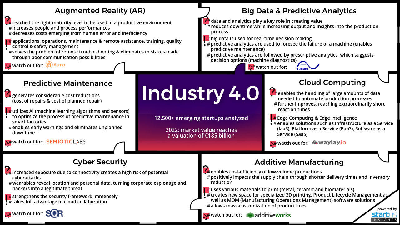 제조 산업이 물리적 자산에서 사이버 물리 시스템으로 전환함에 따라 자동화 및 데이터 교환은 스마트 팩토리를 더욱 발전시킵니다. 전통적인 접근 방식의 이러한 역전은 새로운 스타트 업과 기술을 보여주는 Industry 4.0 Innovation Map에 표시되어 있습니다.