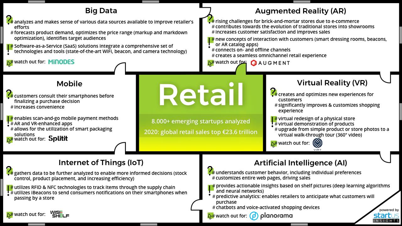 As consumer preferences and behavior change, retailers turn to emerging technologies to keep their customers happy. At StartUs Insights, we took a closer look at 8.000+ startups to identify the innovative technologies driving the retail industry: