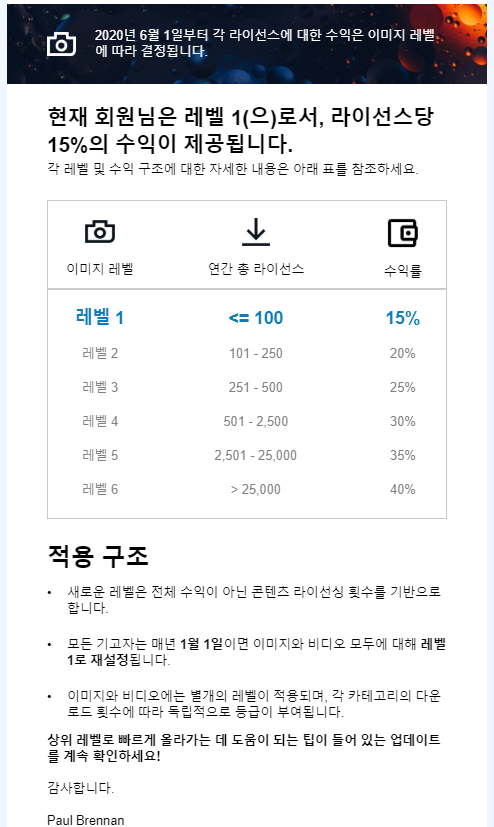 2020년 6월 1일부터 각 라이선스에 대한 수익은 이미지 레벨에 따라 결정됩니다.