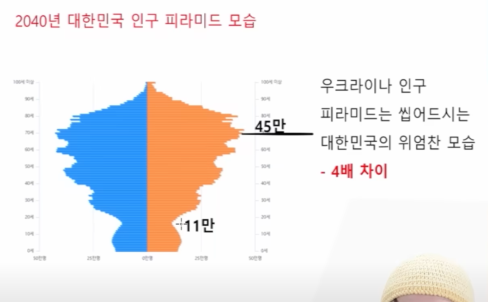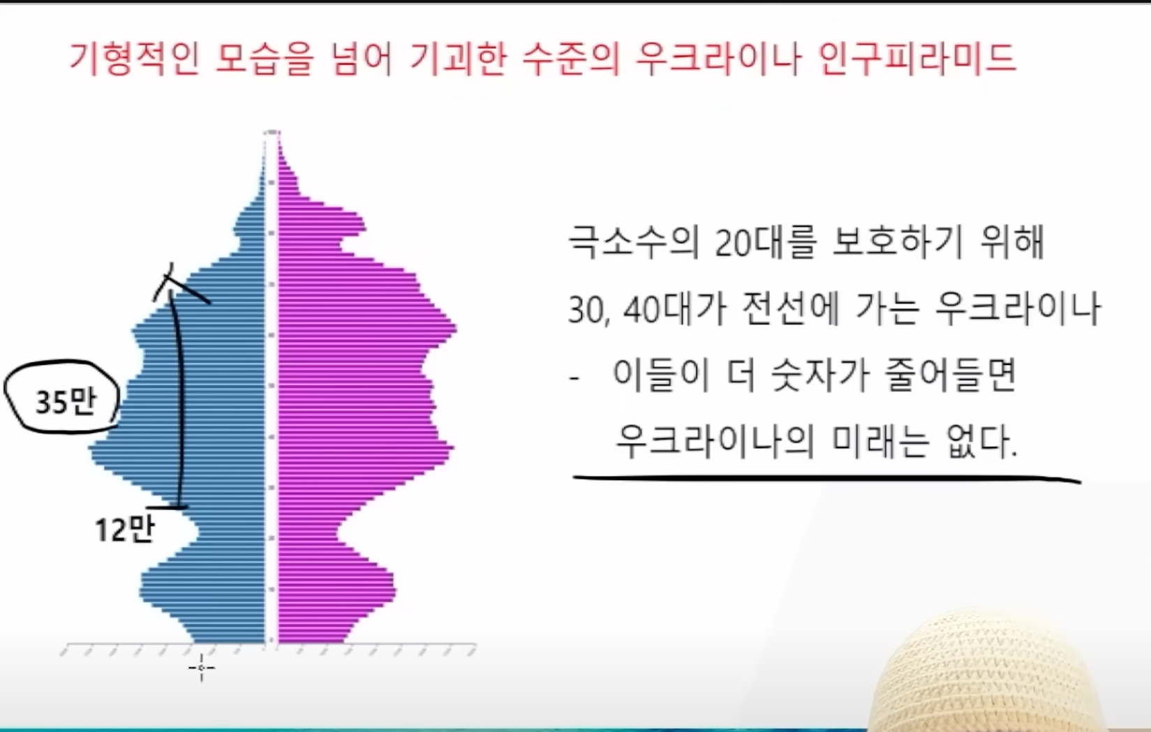 인구도 적었는데 1.1이니까 이런 괴이한 모습을 보였다. 야 ㅎㅎ, 1.1 야, 이 자식들 양호한데? 야 씨, 1.1이면 됐지. 1.1까지 폭락을 해서 반퉁났다는 건데, 그전에는 거의 2 가까이였는데 인구도 적고 출산율이 반퉁 나서 이런 괴이한 모습을 보이게 됐다. 이거 뭐야? 그러면 우리는 1.1도 아니고, 우리는 0.7인데 이게 무슨 소리? 맞습니다, 우크라이나 인구 피라미드가 괴이하다고 볼 필요가 없어요. 왜냐? 우크라이나는 대한민국에 비하면 양반이죠. 대한민국 위에는 45만이에요. 아래는 11만. 나중에 전쟁이 나면, 나중에 인구가 이렇게 될 수도 있겠죠. 아이 많이 낳아서 그러면 여기는 영원토록 아까 우크라이나처럼 이런 흔적이 남는 거예요. 인구에 흔적이 남는 겁니다. 지금 우리는 이렇게 돼 있어요. 우크라이나는 3배라며? 우리는 4배입니다. 0.7이잖아 이 아래도 2040년이니까 희망사항을 그려놓은 거예요. 운 없으면 이렇게 갑니다 ㅎㅎㅎㅎ. 우리는 우크라이나 보고 괴이하다고 생각하는 한국인이 있으면 안 됩니다. 이게 우리가 더 심해요. 우리가 전쟁 나면 과연 어떻게 될까 다시 한번 생각해 봐야 됩니다. 어떤 모습을 보일까. 그래서 우크라이나가 아까 말씀드렸지만, 27세 이하로 징집했던 거는 어쩔 수 없는 결정이기도 했죠. 국가의 미래를 위해서 아이를 낳아야 되는 20대를 보호해야 된다. 근데 저는 이 결정이 또 놀라운 게 이게 남성이잖아 여성이면 여성 한 명이 출산을 하니까. 남성은 출산에 물론 남편은 그게 있지만 직접적인 그거라고 생각할 수도 있는데, 굳이 그렇게 비인간적으로 숫자로만 따지자면 20대를 더 많이 징집할수록 미래 자녀 수가 줄어들고 향후 출생률, 노동력 징집 한 마디로 우크라이나의 미래가 없다고 생각을 해서 더 크게 감소할 것을 매우 우려했다는 거죠. 그래서 어떤 모습이 보이고 있냐 우크라이나 군의 평균 나이가 몇 세냐 43세 얘기가 나오고 있어요. 전쟁 초반에 40세 얘기가 나왔는데 더 올라갔나 봐 43세가 이등병, 상병 그렇습니다..