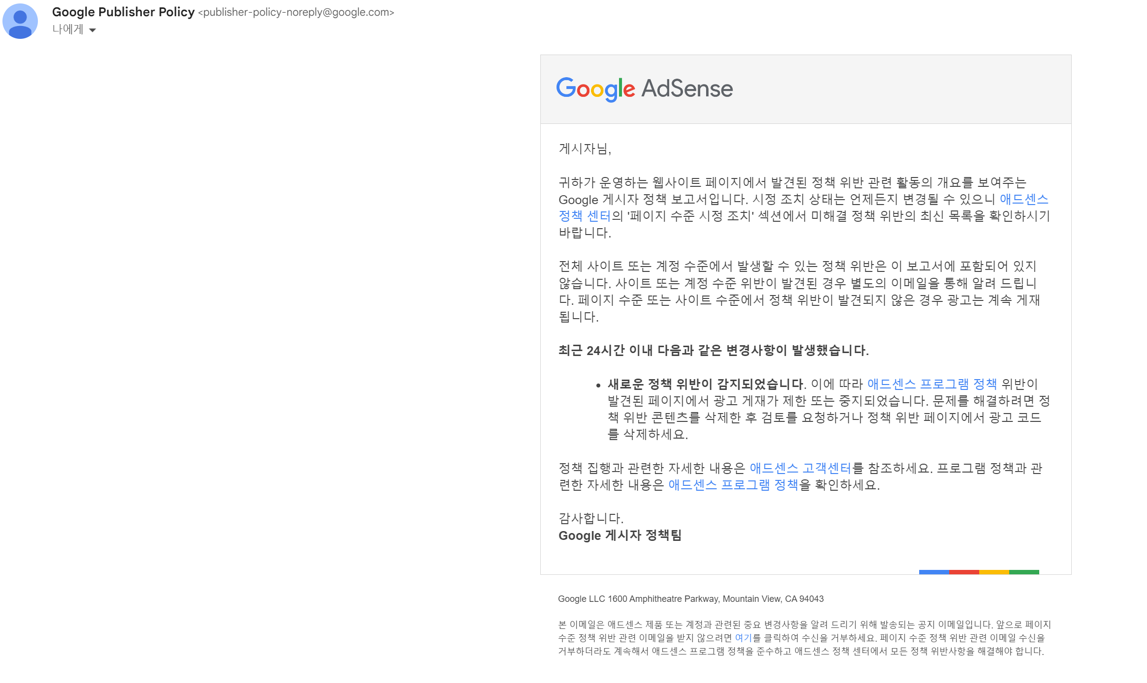 본 이메일은 애드센스 제품 또는 계정과 관련된 중요 변경사항을 알려 드리기 위해 발송되는 공지 이메일입니다. 앞으로 페이지 수준 정책 위반 관련 이메일을 받지 않으려면 여기를 클릭하여 수신을 거부하세요. 페이지 수준 정책 위반 관련 이메일 수신을 거부하더라도 계속해서 애드센스 프로그램 정책을 준수하고 애드센스 정책 센터에서 모든 정책 위반사항을 해결해야 합니다.
