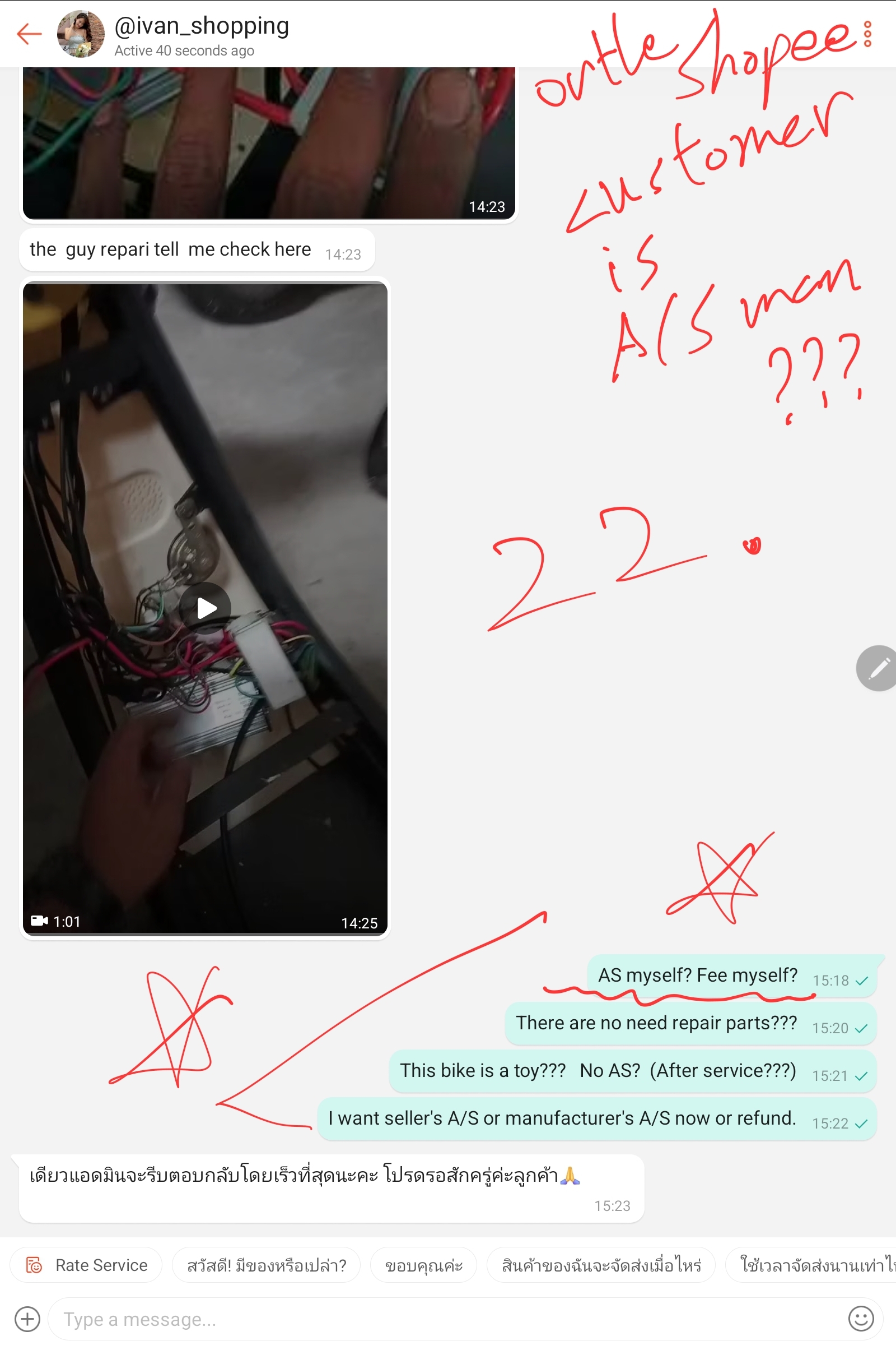 그리고 AS 대응도 없이 단지 판매만하고 사람을 죽을 뻔하게 만든 스쿠터를 수리(A/S)해달라는 요구를 묵살하고 ,, 참고 동영상만 보내는 해괴한 행위, 귀신이나 할 행위를 한 판매업자를 즉각 쇼피에서 퇴출시켜야 한다.