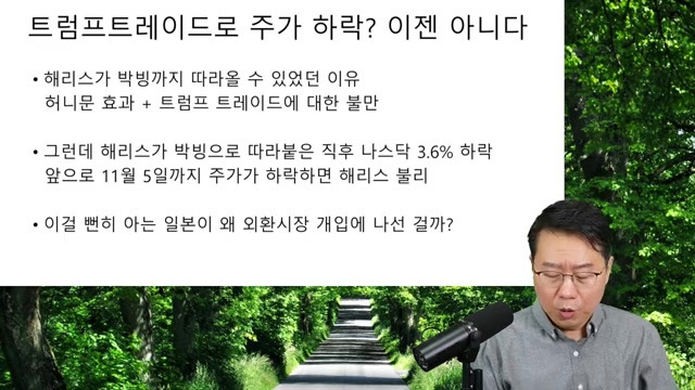그래서 월스트릿 저널에서 이런 걱정을 하잖아요: 일본의 마이너스 금리 종식은, 느리게 움직이는 쓰나미가 될 것입니다. 이렇게 표현을 했는데. 왜 그러냐? 마이너스 금리가 종식이 되고 나서 일본의 금리가 점점 오르게 되잖아요. 그러면 어느 순간에 갑자기이 케리 트레이드 자금이 청산이 될 수 있는 거죠이 과정에서 세계 금융 시장이 영향을 받을 수 있는데요. 이것 때문에 너 환율이 급락한 날, 즉 엔화가치가 갑자기 뛰어 오르니까, 미국 증시까지 함께 출렁거리는 현상이 나타났는데요. 그럴 수밖에 없는게이 증시라인게 항상 좋은 일도 선반영하며. 증시에 영향을 미친 부분도 일부 있었던 겁니다. 지금이 방송을 녹화하고 있는 동안에 애너 환율은 1달러의 153에서 4n 사이를 왔다 갔다 하고 있는데요. 근데 엔화가 여기서 멈춰주면, 면 그래도 어느 정도 괜찮겠지만. 만약에 화의 추가적인 강세가 일어난다, 그러면 헤리스 테 분리할 수밖에 없습니다. 자, 최근 들어서 해리스가 2% 포인트 이겼다는 기사가 우리나라에서 대서 특필 있죠. 근데 정말 신기한 건, 그 뒤에 트럼프가 이렇게 7% 이기거나 3%이긴 적도 많은. 데 이건 우리나라 언론에서 잘 다루지 않더라고요.. 우리나라 언론사나 아니면 기자들이 트럼프가 되는 걸 굉장히 극히 싫어하는 측면이 있기 때문이 아닌가? 이런 생각이 좀 드는데 론. 물론 트럼프가 대통령이 다시 당선이 된다, 면 우리나라 경제에 타격을 줄 수 있어서. 자, 이런 심정은 좀 이해가 가. 지만 만약에 이런 식으로 해리스가 이길 때만 대서특필하고 트럼프가이기는 이런 여론 조사는 잘 보도하지 않는다, 그러면 우리나라 국민들이 오판을 할 수 있기. 때문에 제가 보기엔 양쪽 다 보도의 균형을 맞춰서 정확하게 미국 대선을 판단할 수 있는. 그런 계기를 주는게 언론이 할 일이 아닌가? 이런 생각이 좀 , 듭 니다 자, 그러면 실제로 여론 조사는 어떠. 냐? 물론 해리스가 처음 지명됐을 때 두 번이긴 적이 있습니다, 하지만 전체적으로는 트럼프가 1.9% 포인트 앞서 있고요. 그리고 경합주에서 여전히 트럼프가 앞서 있기. 때문에 지금 당장 대선을 한다, 그러면 트럼프가 당선될 확률이 훨씬 더 높은게 사실이라고 보여집니다. 그런데 여기서 증시 상황이 해리스 테 조금 악영향을 미칠 수 있는 게요.