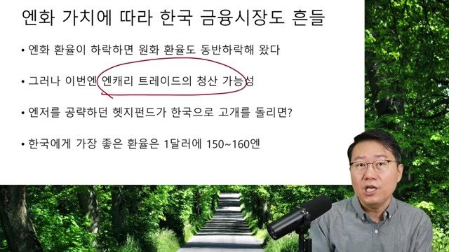 왜 그러냐? 일본이 워낙 저금리가, 이 화를 빌려서 해외로 투자했던 수많은 일본인들 그리고 글로벌 투자자들이. 만약에 환율이 급격하게 변동될 거라고 생각된다면이 해외로 투자해 놨던 이런 돈들을 다 일본으로 갖고 들어올 가능성이 굉장히 커지거든요이 과정에서 한국에도 들어와 있는이 케리 자금이 일본으로 돌아가게 되면 화 환율이 하락한다고, 해서 원화 환율이 동반 하락, 한다고 확언하기는 쉽지가 않습니다. 그리고 또 한 가지 문제가 있는데이 해지 펀드는 자신들의 리터가 꼭 필요하거든요, 특히 환율로 계속해서 투자를 하던 해지 펀드는 또 환율로 투자하는 걸 굉장히 좋아하는데. 그동안 수많은 해지 펀드가 다 엔저를 공략했, 기 때문에 우리나라에는 관심이 없, 었습니다. 왜냐 일본의 엔화 시장의 사이즈가 훨씬 크니까, 이게 더. 좋은 놀이터였던 거죠. 근데이 해지 펀드가 한국으로 고개를 돌린다면, 우리나라 원화 환율이 어느 방향으로 튀지, 그야말로 안개속이다. 이렇게 볼 수 있는데요 자, 그래서 이런 일들이 일어나지 않을 면. 가장 좋은 환율은 1달러에 150엔, 160엔 사이에서, 화 환율이 이렇게 박스권에서 움직이는게 가장 좋지. 만약에 140엔 대로 떨어지거나 또는 160엔 대를 넘어서서 170엔 대까지 간다, 그러면 우리나라 경제에 이게 결코 좋을 수가 없기. 때문에 박스권 환율이 우리 한국 경제에 가장 좋을 것 같다. 이렇게 보여집니다 이제는 세계 경제가 이렇게 한 몸처럼 다 연결돼 있다. 보니까 애화 가치가 어떻게 되, 느냐에 따라서 미 대선에도 영향을 미치고, 이게 글로벌 증시에도 영향을 미치기. 때문에이 애화 가치에 대해서 과연 일본 은행이나 아니면 일본의 재무성이 어떤 태도를 취할 것인지에 대해서 관심을 지속적으로 가질 필요가 있을 것 같습니다. 자, 이제 박종훈의 지식 한방 마치. 시간이 됐습니다. 다음 시간에 뵙겠습니다...