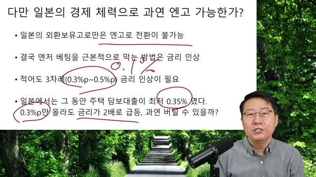 왜냐 일본의 외안 보유고 로마는 고로의 전환 이 불가능합니다. 결국 근본적으로 외환 시장의 분위기를 바꾸려면, 엔저의 배팅을 완전히 막아야 되는데. 그러려면 일본 은행이 적어도 두 차례나 세 차례 정도의 금리 인상이 필요합니다. 일본은 찔끔찔끔 금리를 올릴, 거기 때문에 아마도 0.1% 포인트 밖에 못 올릴 것이다. 이런 얘기가 있다. 보, 니까 세 차례를 올려도, 많이 올려 봐야 0.3에서 0.5% 포인트 올린다. 이렇게 보시면 되거든요: 자, 이런 금리 인상이 없다, 그러면 엔 의 근본적인 문제를 해결할 수 없기. 때문에 결국 금리 인상은 필수다. 이렇게 볼 수 있거든요. 아니면 반대, 로 미국이 아예 2% 포인트점 금리를 전격적으로 인하는, 것도 한 수인인데. 일본 입장에서는 미국이 언젠간 금리를 내리겠지.. 이러고 23년, 24년 상반기에 미국이 금리인할 것만 계속 쳐다보다가, 결국은 계속 뒤통수를 맞은 셈이 됐기. 때문에 미국의 금리 인화만 바라보고 있기에는 이게 약간 불안하단 말이죠. 근데 일본이 금리 인상을 하기에는 체력이 약화된. 가장 큰 문제가 어디에 있느냐? 첫 번째는 일본 정부의 부채가 너무 많고, 이게 금리를 올리게 되면이자 부담이 늘어난다는 겁니다. 이건 많은 분들이 알고 계신데. 또 하나 문제가 있습니다: 일본은 그동안 주택 담보 대출이 최저 0.35% 있습니다, 연리 0.35 REF. 야, 정말 우리나라에 비해서 10분밖에 안 되는. 이런 놀라운 금리를 일본에서는 적용해 왔거든요. 자, 근데 0.3 % 포인트만 올라, 도 금리가 두 배로 올라가는 거잖아요. 과연 일본의 가게가 이걸 버틸 수 있겠느냐? 이런 문제들이 있기 때문에 앞으로 일본이 지속적으로 엔고를 만들어 낼 수 있느냐는 좀 더 지켜봐야 될 것 같습니다.