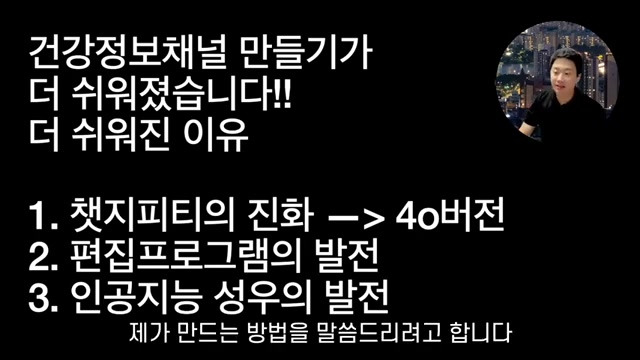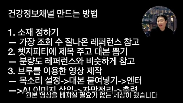 먼저 건강정보 채널 만드는 방법은. 이러한 순서대로 갑니다: 제가 하나하나 보면서 말씀드리도록 할게요. 자, 먼저는 건강 정보 같은 경우에는 어떤 특성이 있는지도 우리가 생각을 해 봐야 되는데. 자, 건강정보는 누가 더 많이 볼까요? 고연령층일수록 이게 지금 되게 중요해요, 고연령층일수록 더 많이 본다. 자, 예를 들어서 10대들이 건강 정보에 대해서 그렇게 관심이 많이 있을까요. 뭐 잘못 먹으면은 암에 걸리고, 뭘 잘 먹으면 관절이 좋아지고, 뭘 잘 먹으면은 근육이 쇠퇴하지 않으며, 뭐 이런 것들을 10대들이 볼까요. 아니죠, 10대들은 신진, 대사가 정상적이라면, 어른들에 비해서는 먹고 싶은 거 다 먹어도 됩니다. 저도 어렸을 때는 뭐 라면 두 개 끓여 먹고, 거기다 밥까지 말아 먹었었어요, 과자도 뭐 한 다섯 봉지씩 그냥 막 들이켜도, 그렇게 막 고도비만이 되, 거나 그렇지를 않았단 말이죠. 근데 나이가 들면, 들수록 대사도 떨어지고, 관절도 좀 안 좋아지고 피로하고, 뭐 이런게 있다. 보니까, 고연령층일수록 건강 정보는 많이 보고 있다는.. 겁니다, 건강 정보를 통해서 여러분들은 시청자들한테 콘텐츠를 만들어서 전해 줘야 되는데. 많은 분들이 실수를 하는게 있습니다, 소재를 정하는데 있어서 그냥 아무렇게나 정하는 경우가 있어요. 자, 소재를 정하실 때는요 일단 레퍼런스라고 건강 정보라고 해 가지고 내 맘대로, 내가 아는 상식을 가지고서 말해야지. 라고만 생각할게 아니라 조회수가 잘 나온 영상들을 가지고 레퍼런스 삼아서 벤치마킹 하자. 이거 되게 중요합니다, 이렇게 어떤 채널을 발견을 하게 되면은 어, 인기순으로 해서 보면, 이렇게 조회수가 나오게 되는 거죠 건강 정보. 또 다른 채널들도 보면은 뭐 9988, 이런 데가 있으면은 인기순으로 정렬해 가지고 요런 것들 보, 시면서 어, 계란 이런 것과 함께 드세요, 눈이 맑아지고, 치매 절대 안 옵니다. 이런 식으로 여러분들께서 또 따라할 수도 있겠죠. 자, 이렇게 소재를 정해 놓고, 대본을 뽑는데. 원래 예전 같은 경우에는 저는 이렇게 소개를 해 드렸었어요: 이런 분들의 영상을 보시, 면서 패러프레이징 해 봐라. 이런 식으로 말씀을 드렸었어요. 근데 지금은 패러프레이징 할 필요가 없어요, 원본 영상을 기실 필요가 없는 세상이 .