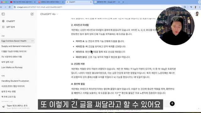 됐습니다 자, 왜 그런가 보면은요 자, 예를 들면은 랑 그냥 먹지, 마세요 달걀, 이것과 함께 먹으면, 눈이 밝아지고, 치매가 사라집니다. 이런 이야기를 자 이거는 제목만 따와 보시는 거예, 제목만 따서, 채 피티로 들어가셔서 한번 요청을 해보는 겁니다, 청을 해 볼게요라는. 이렇게라는 제목으로 기사문을 작성해 줘라고 해 볼게요 자. 그러면 이런 식으로 글을 써줬습니다. 계란은 다양한 영양소를 함유하고 있어 건강에 많은 이점을 제공하는 식품으로 알려져 있습니다. 그러나 최근 에, 구에 따르면, 계란을 특정 음식과 함께 섭취할 경우 눈 건강과 치매 예방에 더욱 효과적이라는 사실이 밝혀졌습니다. 그렇다면 계란을 어떤 음식과 함께 먹어야 될까요? 블루베리와 계란? 블루베리는 항산화 물질인 안토시, 안토시아닌이 풍부, 하여 눈 건강에 매우 유익합니다.. 계란에 비타민 A 결합을 하면 시력을 보호, 하고 망막의 성상을 예방하는데 도움이 됩니다. 계란 후라이 위해 신선한 블루베리를 얹어 먹, 거나 블 블루베리 스무디에 삶은 계란을 곁드려 보세요이 조합은 눈에 피로를 줄이고, 시력을 개선하는데 큰 도움이 됩니다. 자, 그러면은 뭐 이런 거 진짜 사실인지 한번 블루베리와 계란 검색해 가지고. 얘가 혹시 헛소리 하는 건 아닌가. 한번 확인을 해 봐야 돼. 요 계란, 노른자와 블루베리, 기억력이 향상되고. 어 좋다고, 지금 얘기가 나오고 있는 거 같아요, 요런 것들 한번 보시면서 또 브로콜리와 계란, 견과류와 계란, 시금치와 계란, 이런 식으로 이제 써 줬단 말이에요, 이거를 여러분들께서 만약에 어 요구뿐만 아니라 좀 더 좋은 정보로 하고 싶다, 그러면은 여기서 대본을 조금은 참고를 하셔 가지고. 요렇게도 가능하겠죠. 여기 보면은 자, 뭐랑 먹으라고 되어 있는지는 보면서 자, 여기는 보니까, 지금 여기 위에 큰 제목이 있어요. 그러면은 얘한테 물어보면 되죠, 계란의 영양 성분에 대해 기사문을 작성해 줘, 이렇게 얘기를 하고요 자. 그러면 뭐가 들어갔는지에 대해서 이야기를 해 줄 거고요 자, 그리고 또 계란의 효능에 해서 이야기를 해 줘. 또 할 수도 있겠죠, 계란의 효능에 대해서 기사문을 작성해 줘, 이렇게도 또 얘기를 할 수 있고요. 계란의 콜레스테롤에 대해서, 계란을 건강하게 먹는 방법에 대해서, 계란과 함께 먹으면 좋은 음식에 대해서 써 줘라고 이제 여기에서 나오는 큰 제목들만 가지고서도 또 이렇게 긴 글을 써 달라고 할 수 있어요.