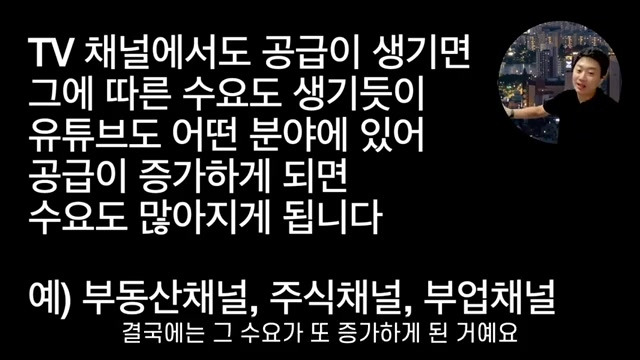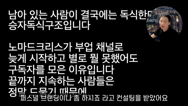 원래는 유튜브에서 경제, 뭐 이런 거를 볼 일이 없었잖아요. 우리가 tv's 전문가가 하는 이야기나 봤었지. 원래 그거에 관심이 없었는데 데. 유튜브에 그런 것들이 이제 어 점점 공급이 많아지다 보, 니까 원래 그쪽 분야에는 관심이 없었던 사람들도 저처럼 저도 원래 그런 거에 관심이 별로 없었거든요. 근데 유튜브에서 계속 노출이 되다, 보니까 관심이 생기는 거예요, 그래서 그걸 이용하는 사람이 됐다는 거죠. 이걸 우리가 기억을 해야 된다는 거예요.. 일단은 공급이 많아지게 되면은 사람들이 원래 건강 정보에 관심이 없었을지라도 계속 나오다 보니까 이제 점점 많아지게 되는 거죠. 옛날에는 그런 건강 정보 프로그램이 TV 그래도 무슨 생로병 사의 비밀요 정도에서만 나오다, 보니까 저희 할머니는 그거 나올 때 막 반드시 그 시간에 막 기다리셨다가 보셨단 말이에요. 근데 지금은 그렇게 할 필요가 없어졌죠. 원래는 이제 나이가 많으신 분들이나 관심을 갖고 보겠지만, 유튜브에 뭔가 건강 정보가 계속 노출이 되잖아요. 그러면 원래 나는 건강에 대해서 그렇게 관심이 없었고, 신경 쓰지 않았던 사람. 일지라도 공급이 많아지니까 이제 그 거기에 이제 관심이 생기게 되는 현상이 생긴다, 이해가 좀 되셨죠. 그러니까 공급이 많아지면, 수요도 많아지게 되는 거예요. 자, 그런데 여기에서 이제 문제가 발생을 합니다. 뭐냐면은 많은 사람들이 채널을 운영하다가 자 처음에는 갑자기 공급이 팍 증가를 하, 니까 수요가 그거를 다 받쳐 주지를 못 해요. 자, 예를 들어서 제 오늘이 영상을 보고, 건강정보 채널을 만들 사람들이 뭐 예를 들어서 한 100명이 됐다고 생각을 해 보자고요, 100명 여기 이제 많은 분들이 또 보시겠지만 100명이이 영상을 보고 한번 시도를 해 봤어요, 근데 1년 뒤에이 100명 중에서 꾸준히 이걸 운영하고 계시는 분들이 제 마음으로 는 100. 명, 모두가 다 계속하고 있기를 바라. 지만 사람이 그렇게 끈질기기 못해요. 예, 이게 진짜 어려운 겁니다. 그래서 오히려 반대로 끝까지 붙잡기만 하고 있어도 쉬워집니다, 왜냐면은 많은 사람들이 일시적으로이 채널들을 막 만들어 가지고. 막 수요가 이제 생겼어. 수요는 생겼어요. 그래서 건강 정보라는 것에 대해서 사람들이 원래는 생각지도 않았, 는데. 괜히 이제 많은 유튜버들이 막 영상을 만드, 니까 바람이 들어가는 거. 예요, 바람이 들어가서 이제 건강정보 채널에 대한 바람이 막 주는데. 사람들이 이제 처음에는 수요가 받쳐주지 못하니까. 어떻게 보면은 이제 유튜브 조회수가 안 나와서, 재미가 없어, 서 그만두는 분들도 95% 이상이 될 겁니다.. 굉장히 많은 분들이 그만두게 될 거예요. 자, 근데 공급이 그렇게 되면 점점 줄어들게 되겠죠. 근데 사람들의 수요는 어때요, 수요는 또 남아 있는 현상이 있. 단 말이에요: 수요는 생겼어, 건강 정보에 대한 바람이 불어 가지고, 수요는 생겼는데, 공급이 갑자기 점점 점점 줄어들어 자, 그러면은 결국에는 살아남은 사람들한테 이 수요가 쏠리게 되는 현상이 벌어지게 된다는 겁니다. 남아 있는 사람이 결국에는 독식하는 구조가 돼요. 제가 봤을 때는 이게 유튜브식 승자 독식 구조입니다. 저 같은 경우에도 부업 채널로 늦게 시작했어요. 저보다 먼저 시작하신 분들이, 저보다 먼저 시작하신 분들이 진짜 많았어요. 그리고 제가 처음 시작했을 때가 2021년이 있는데, 제가 유튜브 컨설팅 같은 거를 전문가들한테 봤잖아요. 그러면 그분들이 다 뭐라고 했냐면: 노마드 크리스, 님은 지금 돈 버는 채널을 너무 좀 늦게 시작하셨어요. 2, 20년에 이미 그거 하셨던 분들이 10만. 유튜버 다들 되, 셨고. 지금 이제 꿀 깔고 계시는데. 노마드 크리스 님은 늦게 시작하셨고, 때문에 고전하 수밖에 없습니다. 그래서 그냥 한 5만 명 정도 모으시고, 그냥 퍼스널 브랜딩이나 좀 , 하시죠. 라고 컨설팅을 받았어요.