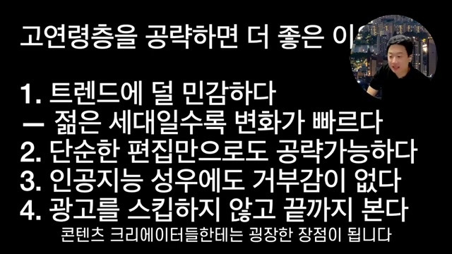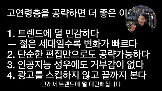 이걸 기억을 하세요. 그렇다 보니까 우리 가 어떤 콘텐츠를 만드는데 있어서도 젊은 세대를 공략하려면 변화하는 트렌드를 굉장히 빠르게 이해하고, 그 이해한 것을 또 내 콘텐츠에 적용을 시켜야 되는데. 이게 굉장히 어려운 일이라는 거죠. 그렇지만 고연령층일수록 내가 어떤 트렌드를 하나 알아 놓기만 한다면, 이게 그렇게 많이 바뀌는 것 없이 그대로 진행을 하면 , 되기 때문에 쉽게 콘텐츠를 만들어 갈 수가 있습니다 그리고 단순한 편집만으로도 공략이 가능합니다. 자, 젊은 세대들은 화면이 휙 퀵 바뀌면서 막 효과도 들어가고, 막 정신없게 해 줘야 돼요. 젊은 사람들이 보는 채널 일수록 그런 효과들을 많이 넣어 줘야 됩니다. 하지만 고연령층일수록 그렇게 정신 산만하게 많은 효과들이 들어가면, 오히려 조금 정신 없어 합니다, 집중을 잘 못 하겠다고 말씀을 하세요. 특히 젊은 사람들이 보는 콘텐츠들의 경우에는 말도 되게 빨리 해야 돼요, 숨 쉬기만 해도 뒤로 가기를 누른다고 하는데. 연령대가 높으실수록 그렇게 막 타이트하게 다 잘라내는 것보다는 약간의 여유를 두고, 말 속도도 어느 정도는 조금 이렇게 정속으로 가도, 그렇게 막 답답해 하시지 않습니다. 그게 굉장한 장점이에요.. 그리고 인공지능 성우를 사용을 할 경우에도 그렇게 큰 거부감이 없으십니다. 인공지능 성우를 사용했다 했을 때 젊은 세대들은 금방 눈치를 채거나. 그런데 나이대가 좀 있으신 분들의 경우에는 사실 그게 인공지능 성우인지라 경우도 많이 있어요. 물론 알고 계시는 분들, 도 있지만 인공지능 성우라고 해도 도 모르시는 분들도 있습니다. 그렇다 보, 니까 우리가 인공지능 성우를 활용해서 자동 영상을 생성함에 있어서도고 연령층을 겨냥할 때에는 적합할 수 있다, 말씀을 드리는 거죠. 그리고 광고, 이거 되게 중요한, 데 광고를 스킵하지 않고 끝까지 보십니다. 젊은 층들의 경우에는 사실이 개념이 약간 그게 고연령층 보다는 조금은 다른 사회에 살고 있어요. 고연령층일수록 옛날에 이제 상부, 상조라이프 좋고, 뭐 이런 말들이 잖아요. 어, 이런 것들을 좋아해서, 어이 영상의, 그 콘텐츠 크리에이터가 내가 광고를 봐 줄 경우에는 뭐이 사람이 돈을 번다고 하니까 어, 그거를 그냥 좋아서, 끝까지 봐 주시는 분들도 정말 많이 있어요. 고 연령층의 경우에는 시간적인 여유도 오히려 이제 젊으신 분들보다 조금 더 있는 편이에요, 경제력과 구매력도 오히려 더 높은 편이라, 서 광고도 스킵하지 않고 본다는 것이 콘텐츠 크리에이터들 테는 굉장한 장점이 됩니다.