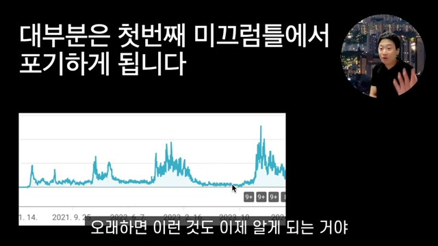 굉장히 유명하신 분의 유튜브 컨설팅이 있습니다. 제가 그때 이미 끝을 먼저 시한부처럼 받았단. 말이에요: 얼마나 청천 병력 내로라는 유튜브 전문가가 저보고 어, 저보고 5만 유튜버가 한 개일 거니까: 어, 거기까지 가시고, 그냥 고만고만하게, 그냥 퍼스널 브랜딩이나 좀 하시고, 돈 버셔서. 이런 식으로 얘기를 했다고요 일찍히 전문가가 그만큼 밖에 안 된다고 하, 니까: 난 그만 둬야 되겠다. 하지만 그렇게 생각하기보다는 일단은 끝까지 해 보겠다. 저 사람이 말이 진리는 아니잖아요, 또 바뀔 수도 있는 거잖아요. 저는 그 생각을 가지고 일단은 꾸준히 했거든요. 쉽지는 않았어요, 쉽지는 않았는데, 그래도 꾸준히 했어요. 자, 이게 제가 유튜브 , 그래프 입니다, 꾸준히 했어요, 꾸준히.. 많은 분들이이 첫 번째 산에서 정점을 찍고 내려갈 때쯤에 다 그만 둬요, 진짜 다 그만둬요. 제가 3년 전에 그 10만 넘어 가지고, 제가 감히 눈도 마주칠 수 없었던 그런 유튜버분들 중에서 지금까지 꾸준히 하고 계신 분들이 다섯 손가락 안에 꼽아요 지금 그렇게 많지를 못합니다. 저도 조회수가 안 나올 때도 있었겠죠요 구간도 있고, 요런 구간도 있잖아요. 이때 진짜 그만두고 싶었습니다. 아 너무, 너무 조회수 안 나온다. 나는 망했나, 특히 작년. 이게 작년 그래프 든 요 작년, 작년 이맘때쯤 그래프에, 작년 이 맘때 자, 이때 얼마나 제가 정말 힘들었을까. 한번 상상을, 한번 해 보시기를 바라겠습니다 여기 바닥도 찍어 봤잖아요 지금 바닥 도. 찍었어요, 여기 바닥 보이시죠, 요때 바닥까지 가진 않았어, 요땐 바닥이었다, 그요 자, 그럼에도 불구하고 꾸준히 하는 거예요, 꾸준히 꾸준히 했더니 또 정점을 찍어요, 그러면서 또 이제 서, 멀 서멀 또 내려가는 거를 경험을 또 하고는 있죠. 자, 근데 저는 이거를 지금 사이클을 몇 번을 겪다 보니까 아, 이런 것도 생긴 거예요, 원래 요맘 때는 조금 내가 조회수가 좀 안 나오는구나, 요때 비슷하잖아요, 오해 하면 이런 것도 이제 알게 되는 거. 예, 요.