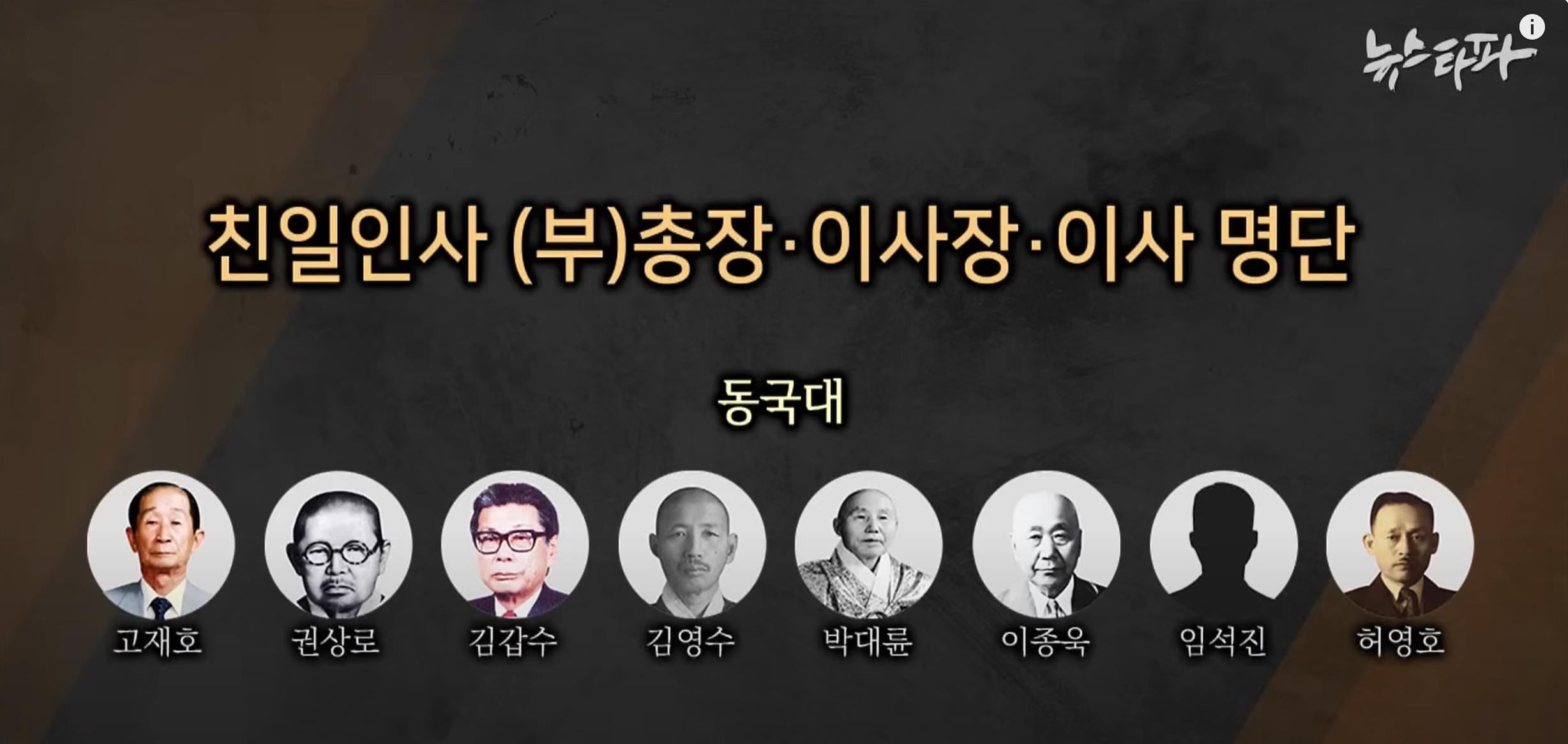 - 각 대학에서 동국대 8명, 이화여대 6명, 숙명여대 6명 등 다양한 친일 인사가 총장이나 이사장 역할을 했다.