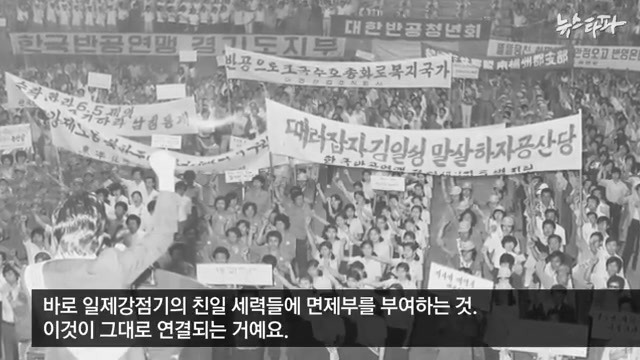 주재진은 친일 청산에 반대했던 입장이 아직 그대로인지 묻기 위해 그를 찾았다. 어렵게 전화통화가 됐으나 그는 답변을 회피했다. 일제의 전쟁 자금을 지원하기 위해 비녀까지 바치며 일제에 충성했던 고황경. 그가 세운 대학의 총장도 청원서에 이름을 올렸다. 이광자, 서울여대 총장이다.. 그런데 그는 이승만을 건국대통령으로 승모하는 보수단체, 대한민국사랑회의 이사를 맡고 있다. 친일단체에 가입하고 수차례 친일기고문을 썼던 김성수를 옹호한 이기수 고려대총장도 이승만 건국대통령기념사업회 회장을 맡았고 지금도 명예회의에 참석하고 있다. 친일단체에 가입하고 수차례 친일기고문을 썼던 김성수를 옹호한 이기수 고려대총장도 이승만 건국대통령기념사업회 회장을 맡았고 지금도 명예회장이다. 그에게 당시 청원서를 낸 이유를 다시 물었다. 납부끄러운 청원서에 이름을 올린 친일파의 후손, 뉴라이트 계열의 학자, 그리고 이승만을 건국대통령으로 숭배하는 단체의 회장까지. 이들의 관계를 어떻게 봐야 할까. 그다음에 경제성장, 방공. 이것이 우리 한국 근현대에서 가장 중요한 가치라고 생각하는 거죠.