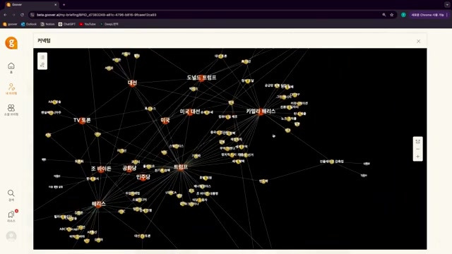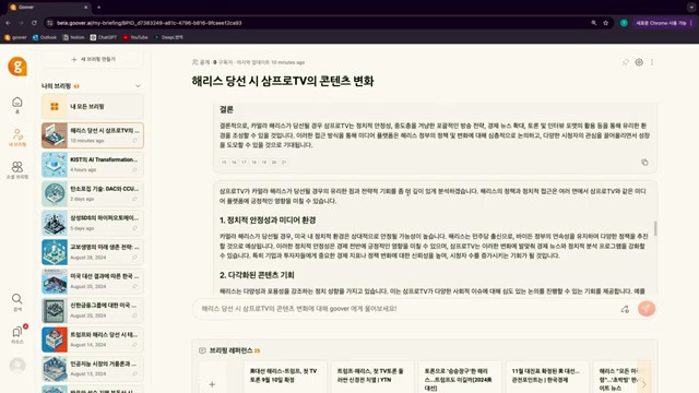 그러면 대표님, 미국 대선의 영향력 분석을 하는 거예요. 그럼 11월 예정 대에 도널드 트럼프가 한국 경제, 증시 나아가서 미디어에 중대한 영향을 미치고, 주식 시장이, 이미 전문가들이 경과를, 특히 자극 우익 정책에서 어쩌고저쩌고 되고 그래서 프로 TV 언더스 대응 전략을 제시해요. 정보 콘텐츠를 확장해야 되는데, 반도체 산업, 수출입 관련된 게. 변동성이 크다는 거예요. 트럼프가 되면 그럴듯하네. 예, 그러니까 이거에 대한 트렌드 민간에 반응할 수 있으니까, 실시간 모니터링 시스템도 하고, 커뮤니케이션 유도하고, 콘텐츠 다양화를 하는데 중요한 건, 이 밑에 레퍼런스가 나와요. 티피 얘기는 없잖아요. 그래서 이거에 대한 근거는 뭐냐, 여기, 여기, 여기라고. 아, 근거를 제시를 했죠.. 티에는 없는 예. 아, 근데 저 근거는 지금 다섯 개, 여섯 개 정도 되는 거 같은데, 조금 막까지 보고 하는 거예요. 더 이상 참고를 한 거, 실제로 이 시스템은 한 100개 정도를 이상을 지금 이 순간에 읽어보고요. 자기가 그 중에 일곱 개를 추천한 거예요. 추천한 거예요. 그중에서 제 관련도가 높은 거 같아. 네, 그리고 나서 여기 심층 답변이라는 걸 예경 후에는 이 서비스 같은 경우는 클릭을 하잖아요. 그 실시간으로 더 조사를 해요. 그리고 나서 미국 대선의 영향력이라는 게 미디어 소비 트렌드가 변화가 돼서 샘플 TV 언더스 대응 전략을 전문성 강화, 라이브 방송하고 인터랙티브 뭐 하고, 뭐 하고 해라. 근데 제가 이거를 해당하는 전략을 트럼프가 당선되었을 때랑 해리스가 되었을 때로 각각 나누어서 제시해 봐라고 하면 이제 또 얘가 공부를 하는 거예요. 이런 게 어디 문서에 있을 리는 없잖아요. 학습했을 리도 없고요. 예. 그럼 밑에 제가 너무 빨리 지나가서 그러는데요. 밑에 해리스와 트럼프에 관련된 이슈들을 지금 이미 검색이 끝난 거예요. 제가 다 검색을 한 거고, 검색한 다음에 여기 있는 애플 AI 환호, 이까 실망, 이까 뭐, 무슨 미국 대선이 한국 AI 끼치는 영향, 뭐 해리스 창업에 대한 어쩌고 저쪽으로 하는 걸지가 조사를 한 거예요.