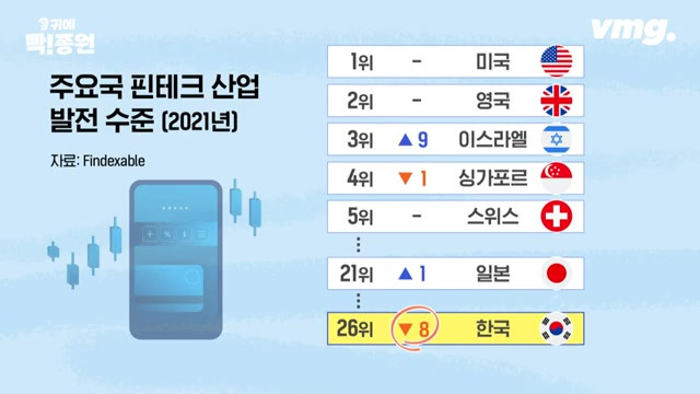 - 한국은 핀테크 분야에서 규제가 강한 나라 중 하나로, 새로운 사업을 하기 어려워지고 있다.