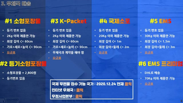 - 각국의 규정에 따라 최대 무게와 발송 불가 지역이 있으니 확인이 필요하다.