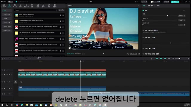 - 마지막으로, 캡컷의 오디오 기능을 이용해 음악을 추가하고 필요 없는 곡은 삭제하여 편집을 마무리할 수 있다.