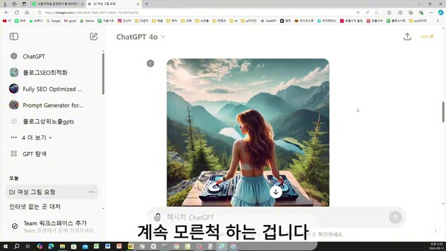 - 예쁜 여성 이미지를 검색해 'DJ 하는 예쁜 여성을 그려줘'라고 요청하자, 기본적인 DJ 모습을 묘사한 프롬프트가 제공되었다.
