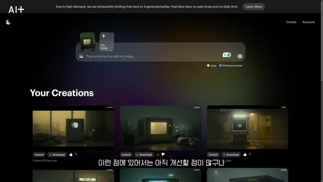 - 그러나 이미지에서 비디오로 변환할 때 의도한 대로 잘 나오지 않는 경우가 많았고, 결과물이 랜덤하게 나오는 문제로 드림머신에 비해 안정감이 떨어진다고 느꼈다.