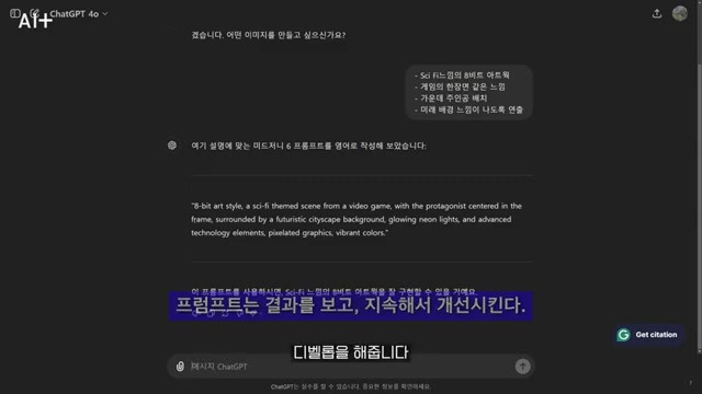 - 예를 들어, '사이파이 느낌의 8비트 아트웍'이라는 프롬프트를 통해, 게임의 한 장면을 연출하고 주인공을 중앙에 배치하여 미래 배경 느낌을 내도록 합니다.