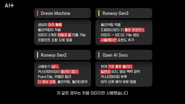 - 주로 첫 번째 프레임을 활용해 영상을 만들고 프롬프트를 간단하게 만들어야 제 효과를 볼 수 있다.