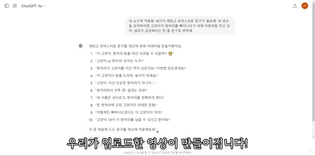 - 이후 GPT를 활용해 흥미를 유발하는 문구를 복사하여, 캡컷에서 적절한 위치에 배치할 수 있으며, 텍스트를 디자인하여 시청자의 관심을 끌도록 한다.