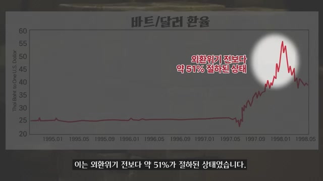 - 그 결과, 태국의 바트화 환율은 약 50바트로 상승하며 외환위기 전보다 51% 절하된 상태로, 국민들에게 큰 피해가 발생하였다 .
