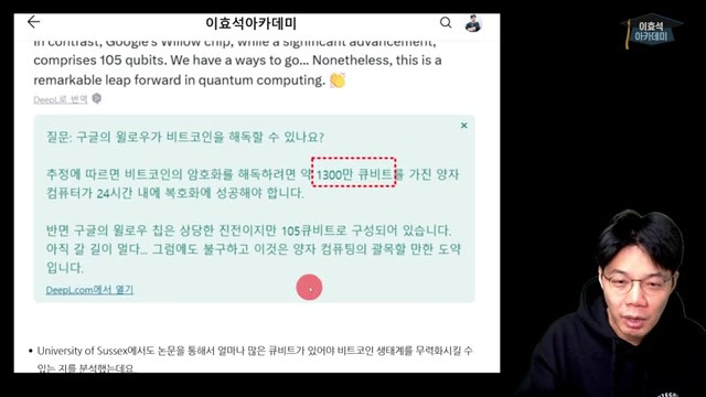 - 최근 논문에서 비트코인 해킹에 1,300만 개의 양자 컴퓨터가 필요하다는 언급이 있다.