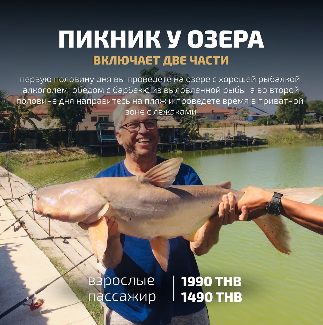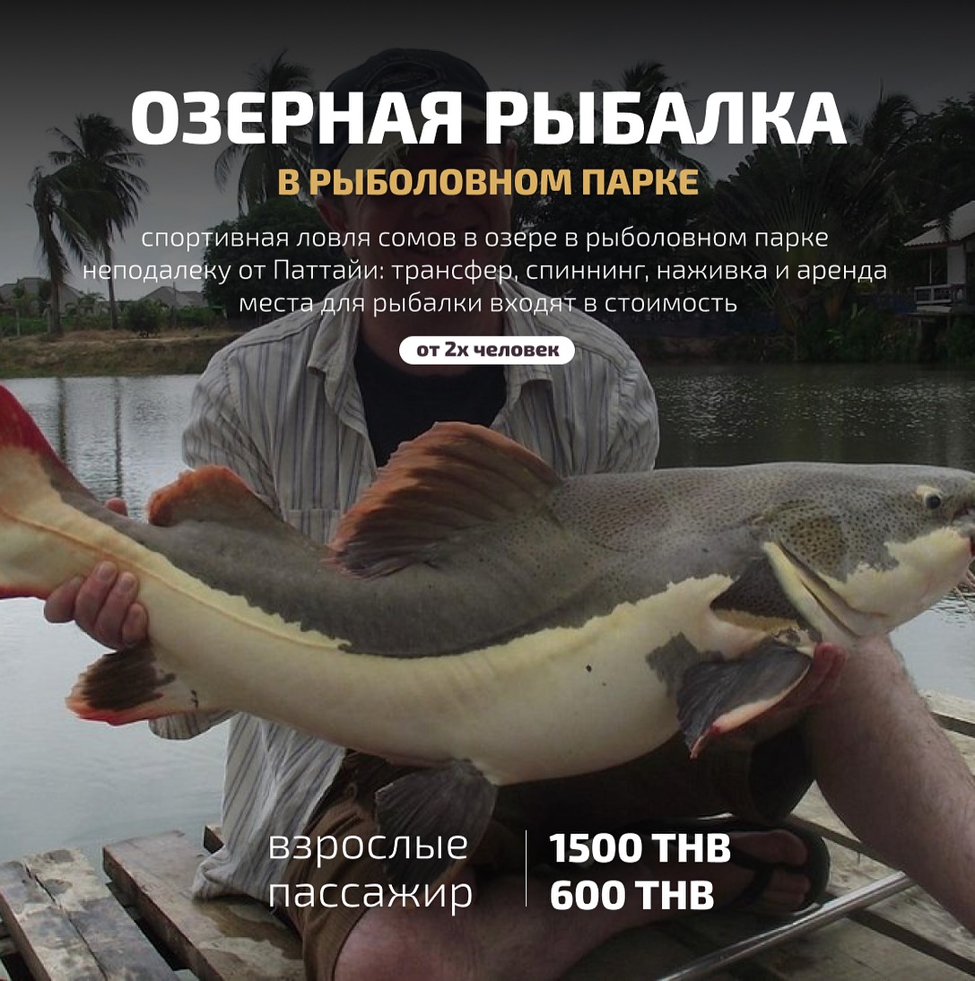 2. Озерная рыбалка – спортивная ловля сомов в озере в рыболовном парке неподалеку от Паттайи: пойманную рыбу можно готовить за дополнительную плату при условии, что рыба мелкая. трансфер, спиннинг, наживка и аренда места для рыбалки входят в стоимость.