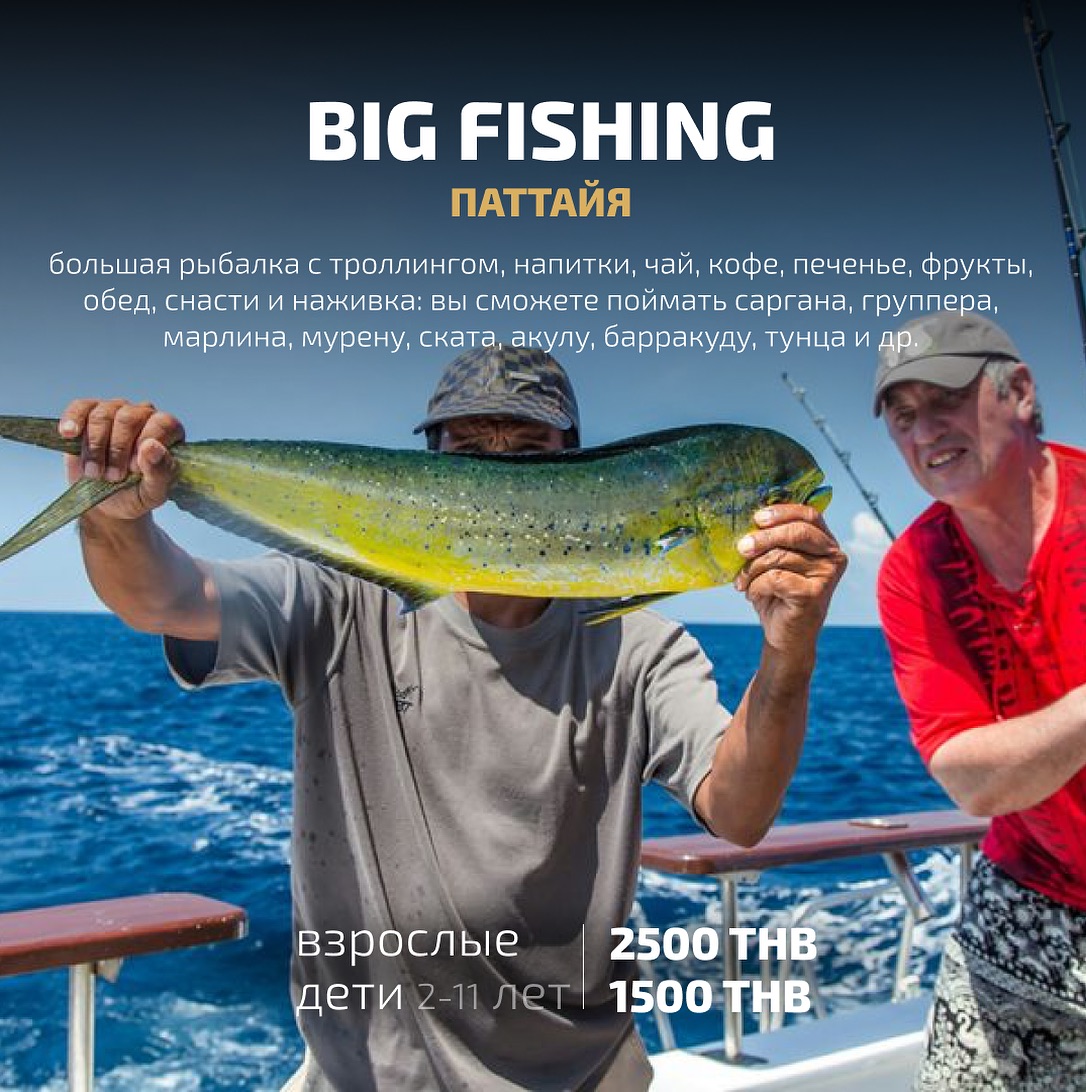 1. BIG FISHING – большая рыбалка с троллингом, к вашим услугам будут прохладительные напитки, чай ,кофе, печенье, фрукты, обед, снасти и наживка: вы сможете поймать саргана, группера, марлина, мурену, ската, акулу, барракуду, тунца и др.