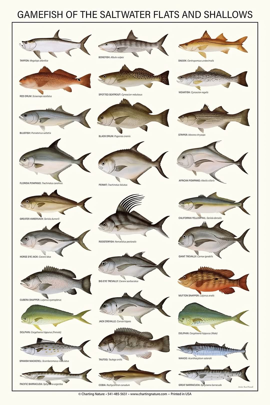 Saltwater Flats and Shallows Gamefish Poster, Identification Chart and Fishermen Guide