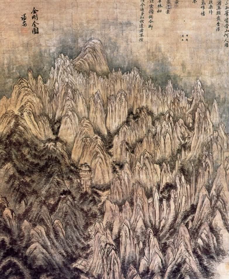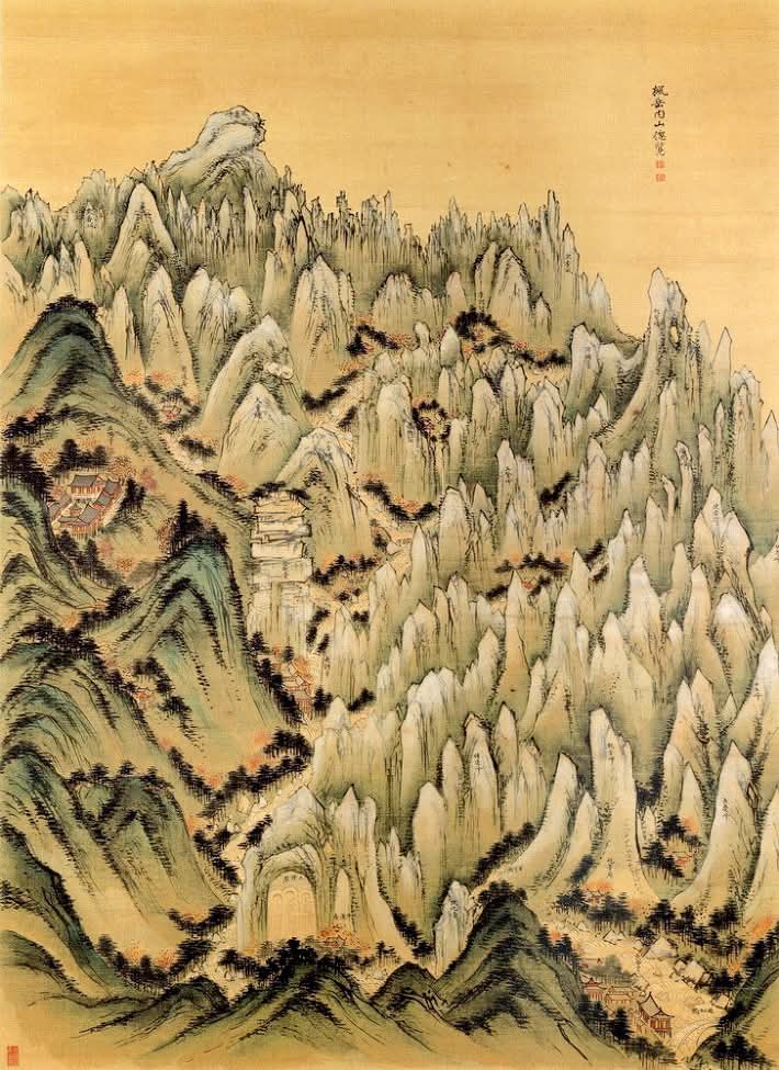 From the years 1711~1712, Jeong Seon visited 금강산(Geumgangsan/Geumgang Mountain, 金剛山) twice and created many paintings of the mountain including ‘신묘년풍악도첩(辛卯年風樂圖帖)‘ and ‘해악전신첩(海嶽傳神帖)’. Thereafter, he succeeded in being recommended by 김창집(Kim Chang-jip, 金昌集) which allowed him to be promoted to various government positions. Jeong spent time painting pieces in different locations and his fame spread all over the country. His popularity skyrocketed by the time of his elderly years in which he had been complimented by not only 사도세자(Crown Prince Sado, 思悼世子) but also 영조(King Yeongjo, 英祖). He fully developed his unique style when he was in his late 60s to 70s.
