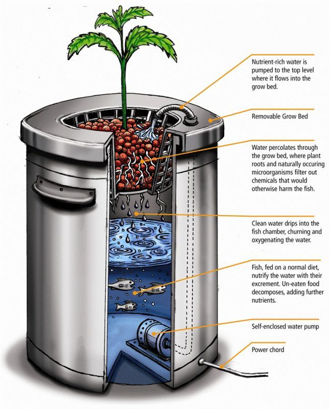 이 시스템은 폐쇄 루프 사이클로 작동하는데, 여기서 물고기 배설물은 식물 성장에 필요한 영양분을 제공하고 식물은 물고기를 위해 물을 걸러내고 정화하는 데 도움이 됩니다.