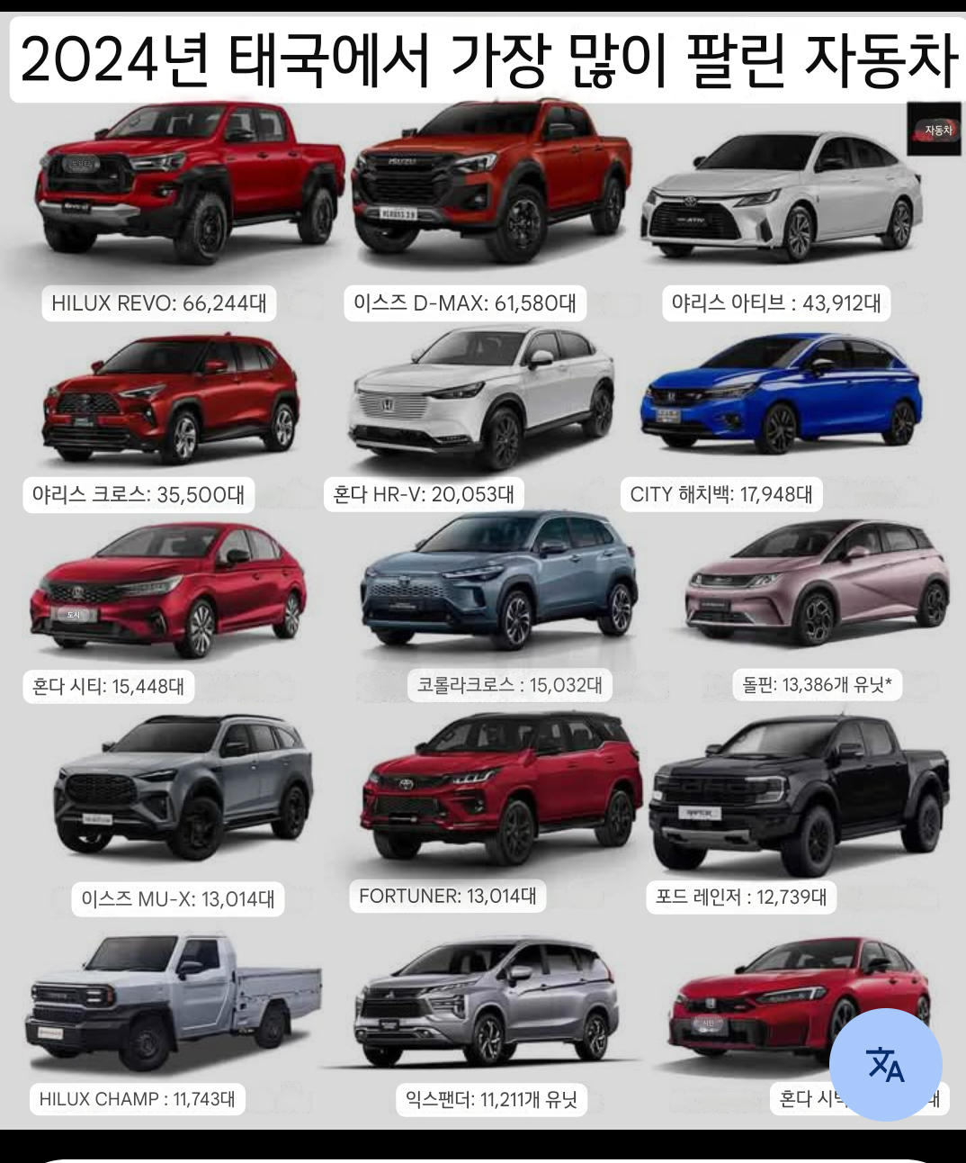 2024년 태국 자동차 시장은 다양한 모델들이 치열한 경쟁을 펼치는 가운데, 특정 모델들이 두각을 나타내고 있습니다. 아래 이미지는 2024년 태국에서 가장 많이 팔린 자동차 모델들의 판매량 순위를 보여줍니다.