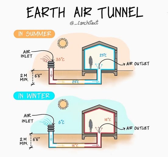 This illustration explains the concept of an Earth Air Tunnel, a passive cooling and heating system that utilizes the stable underground temperature to regulate indoor air conditions throughout the year.
