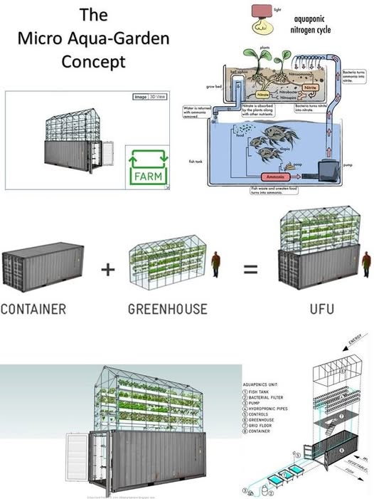 the Micro Aqua-Garden Concept by Robert Stanley, which integrates aquaponics and greenhouse farming into a container-based system. The upper diagram illustrates the aquaponic nitrogen cycle, where fish waste produces ammonia, which is broken down into nitrates by beneficial bacteria to nourish plants. The modular system consists of a shipping container as the base, supporting a greenhouse structure on top, maximizing vertical farming efficiency. This setup, referred to as UFU (Urban Farming Unit), optimizes space, water use, and sustainability, making it ideal for urban agriculture. The lower section provides a 3D perspective of the unit, showing components like the fish tank, bacterial filter, pumps, and hydroponic pipes. The concept is a self-sufficient farm, utilizing renewable energy and resource recycling. Such innovations are crucial for sustainable food production in urban and remote areas.