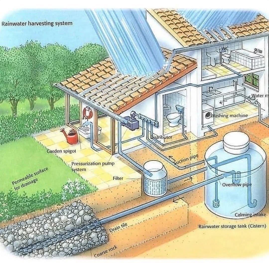 This **rainwater harvesting system** collects and filters rainwater from the roof, storing it in a **cistern** for household use like washing, flushing, and irrigation. A **pressurization pump** distributes the water, while an **overflow system and drain tile** manage excess runoff. This eco-friendly setup promotes **water conservation and sustainability**, reducing reliance on municipal supplies.