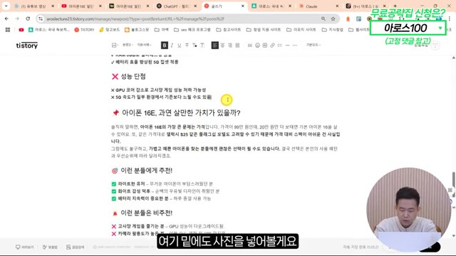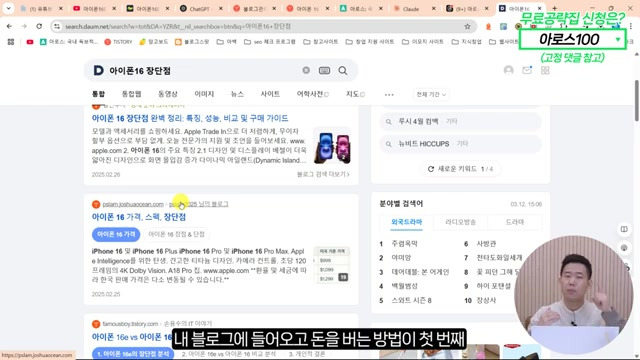 아이폰 16의 장단점을 검색하여 관련된 글을 참고하고, 이와 같은 비교 분석을 통해 블로그를 작성할 수 있다.