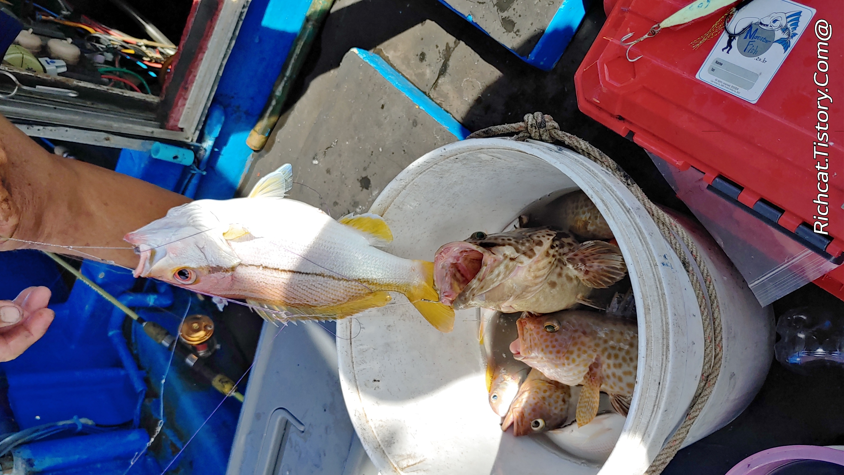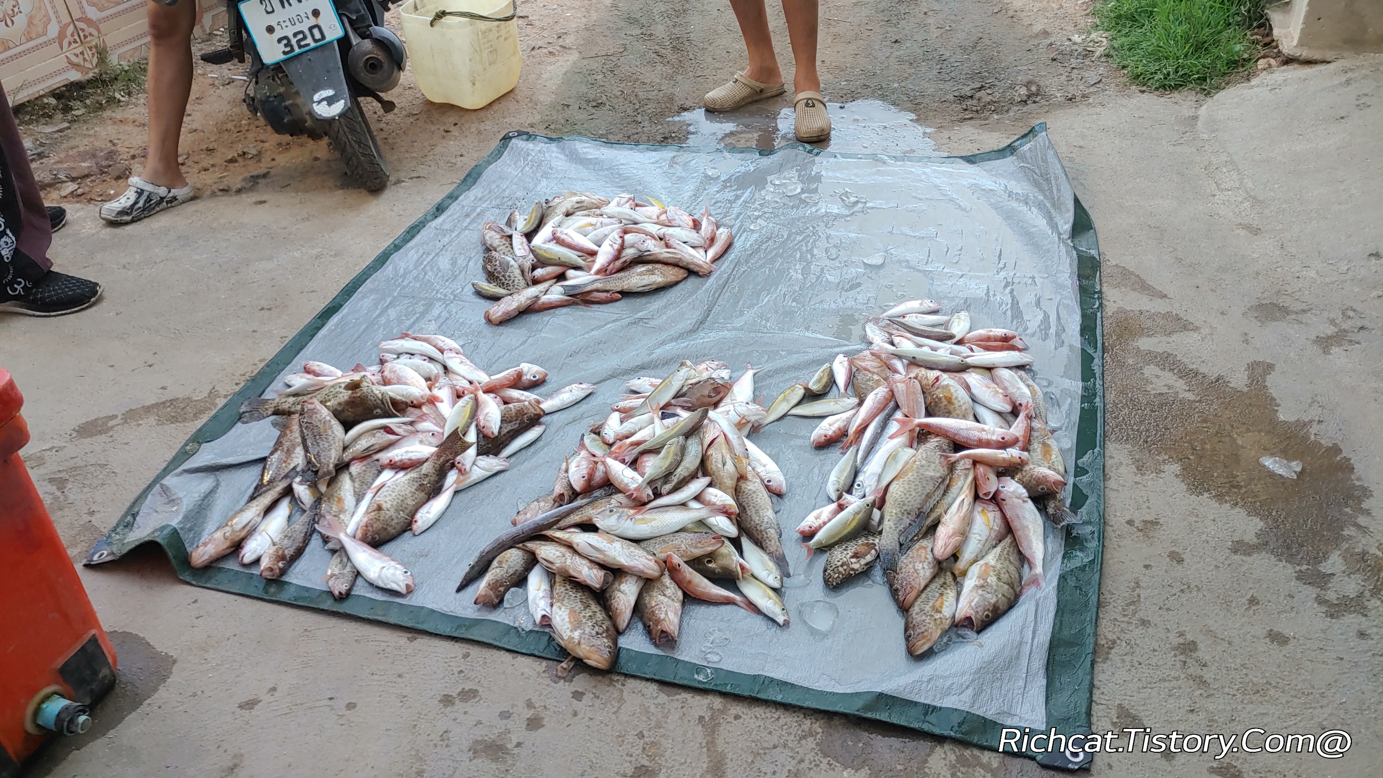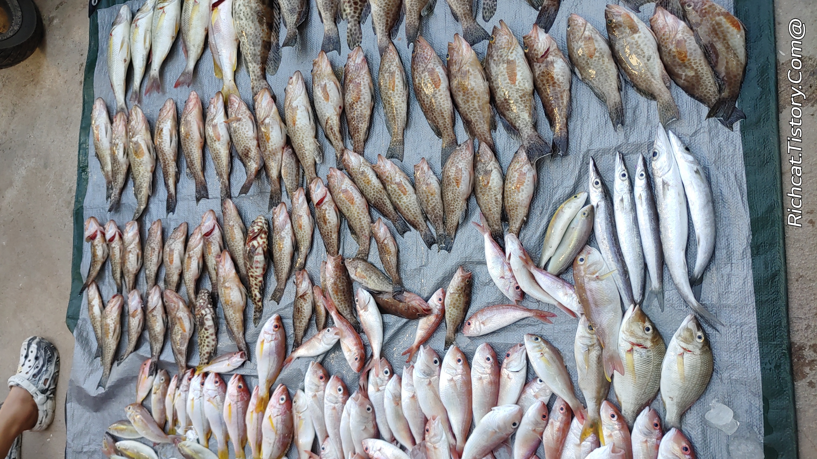 아무튼 많이 잡았고. 선장님의 사모님이 물고기들을 사진 촬영을 위해 이쁘게 분류하고 있다.