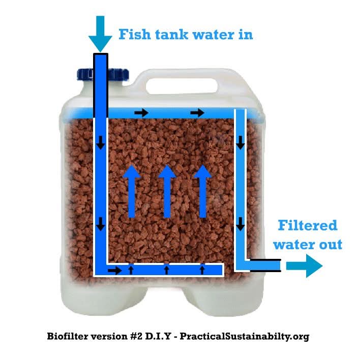 a DIY biofilter system designed for use in aquaponics or fish tank filtration. The system utilizes a container filled with a porous medium, such as expanded clay pellets, to filter water from a fish tank. Water enters the system from the top, flowing downward through the filter media, where beneficial bacteria break down organic waste and toxins. The filtered water then moves horizontally and exits the system, ready to return to the tank or be used for irrigation. This biofilter design efficiently cleans water while promoting healthy water quality for both aquatic life and plants, making it a sustainable solution for small-scale aquaponics setups.