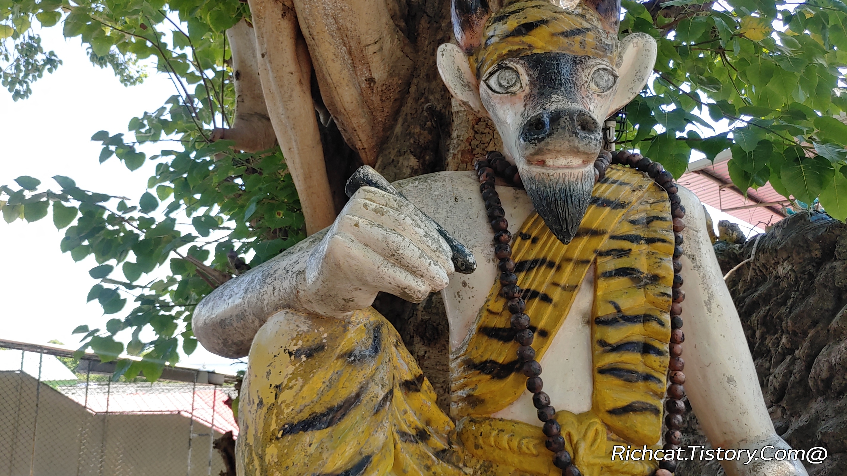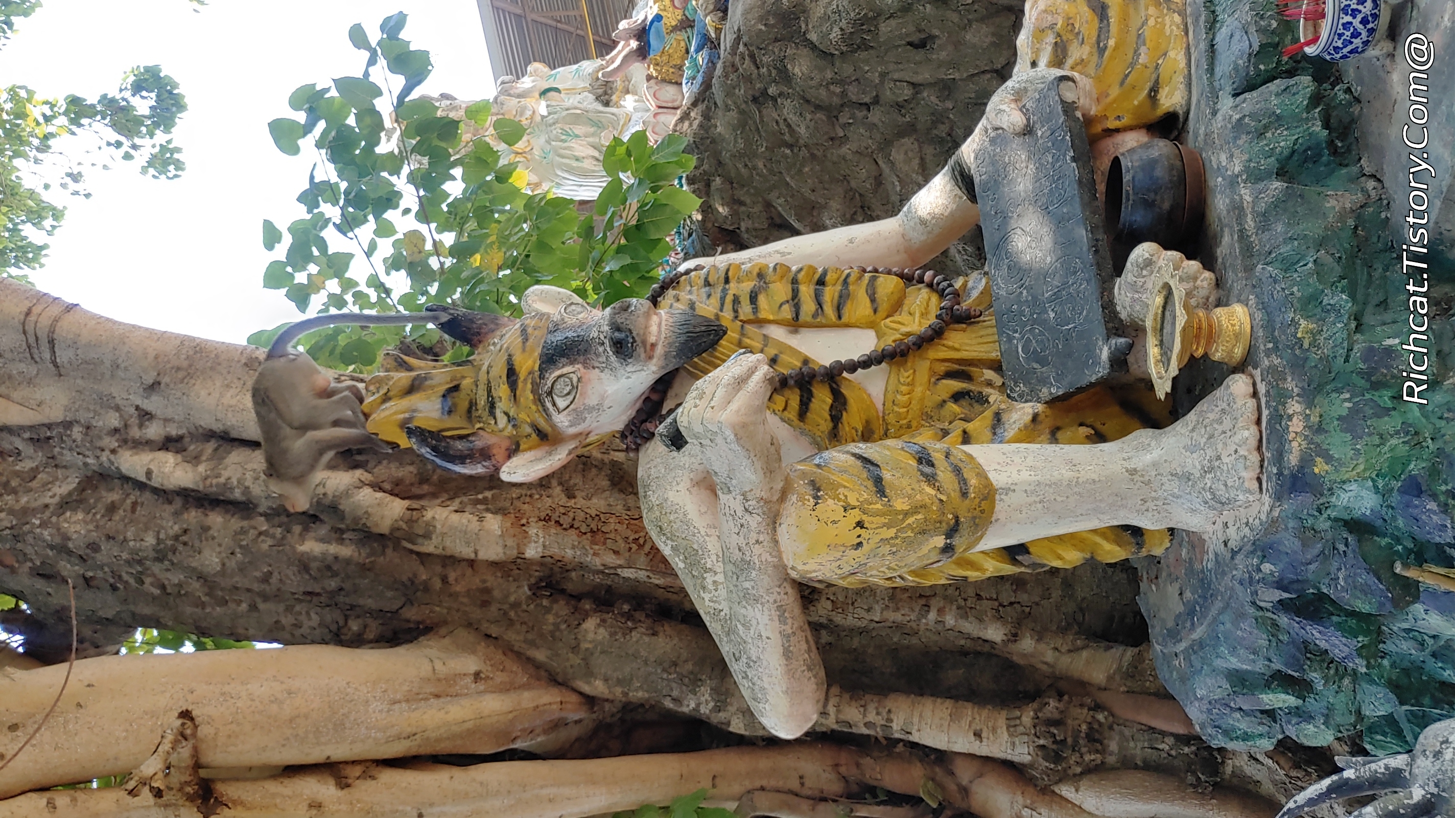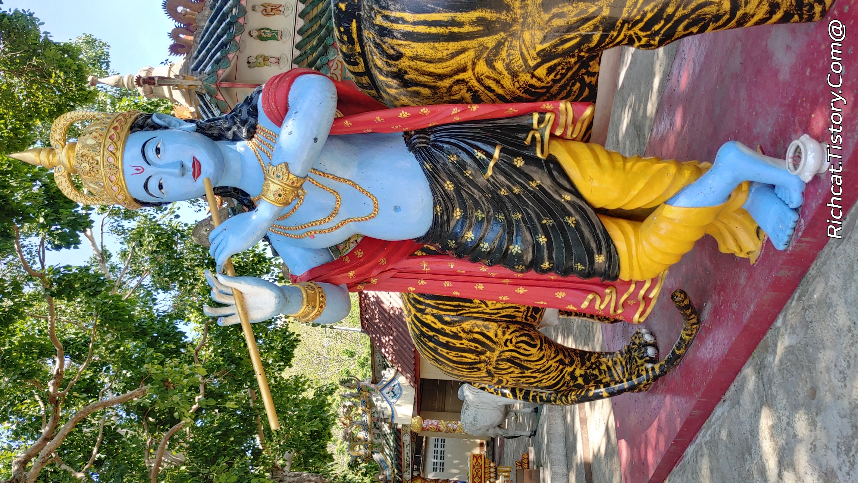 - 하지만 여기에서는 호랑이 같은 동물을 타고 있는데, 이는 지역적 변형이나 동남아 지역, 특히 태국-인도 문화를 섞은 조각일 가능성이 있습니다.