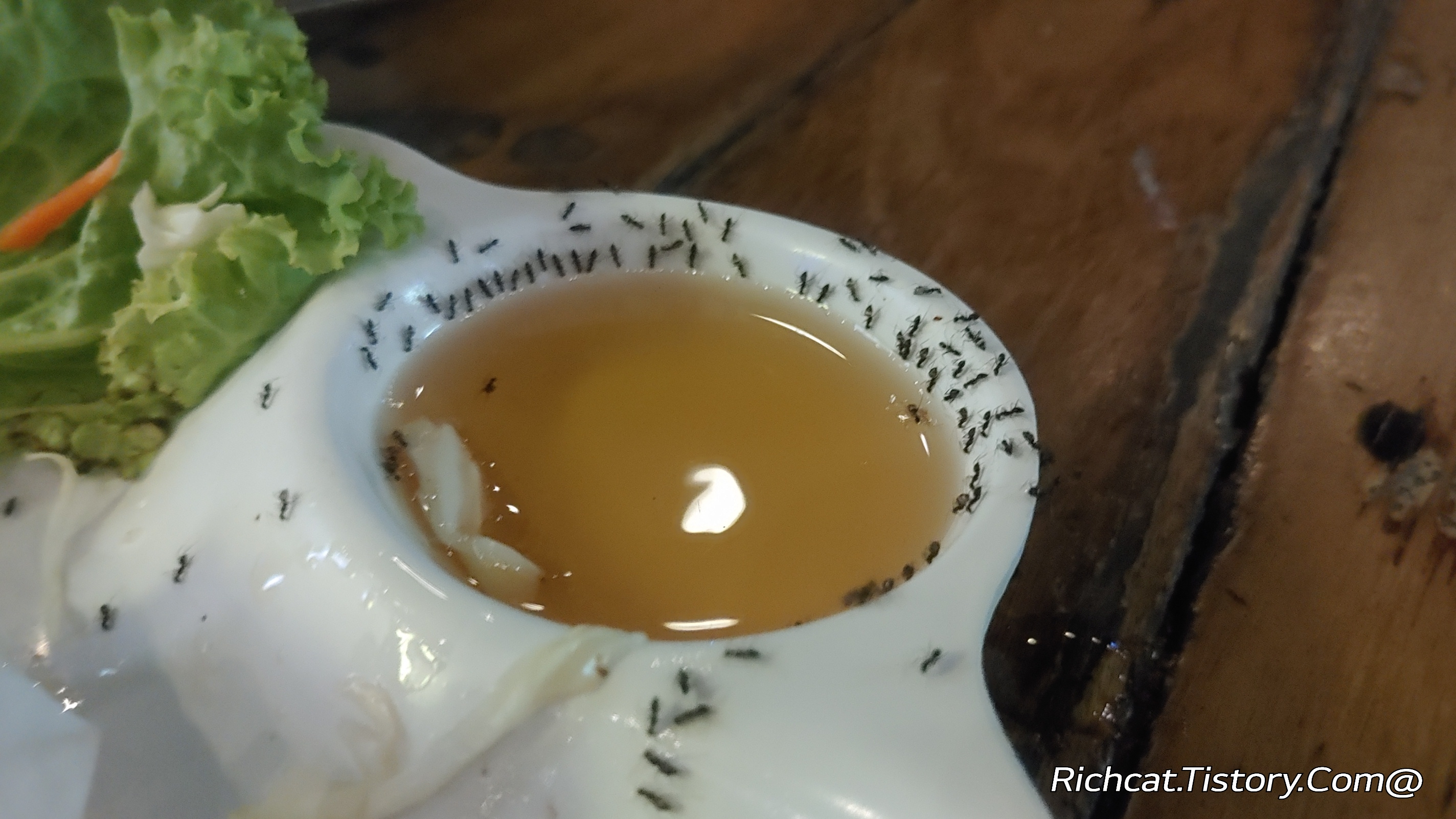개미들이 내가 먹던 닭날개에 몰려 들어왔다
