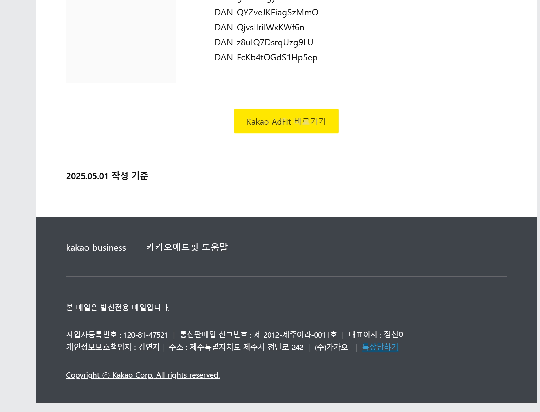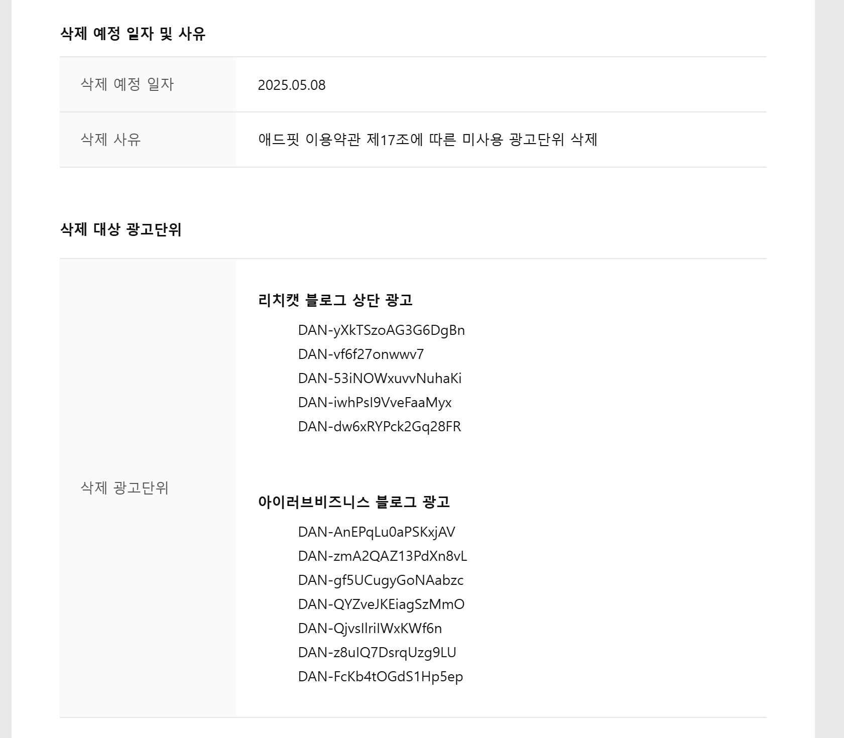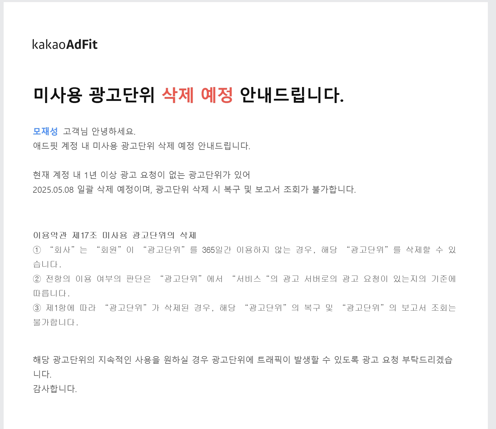 삭제 사유 애드핏 이용약관 제17조에 따른 미사용 광고단위 삭제