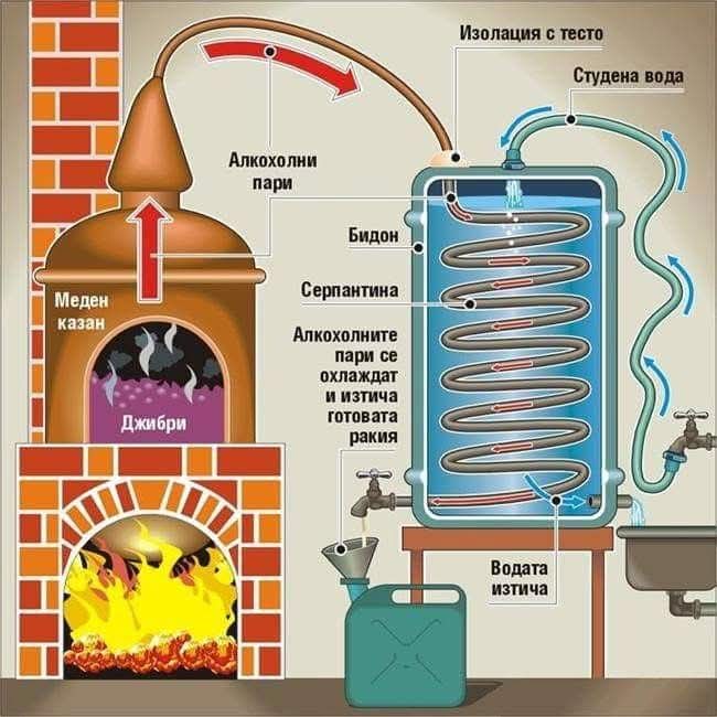- 알코올 증기는 찬 물(Студена вода)이 담긴 통(Бидон) 속의 뱀 모양 관(Серпантина)을 통과하면서 냉각됩니다.