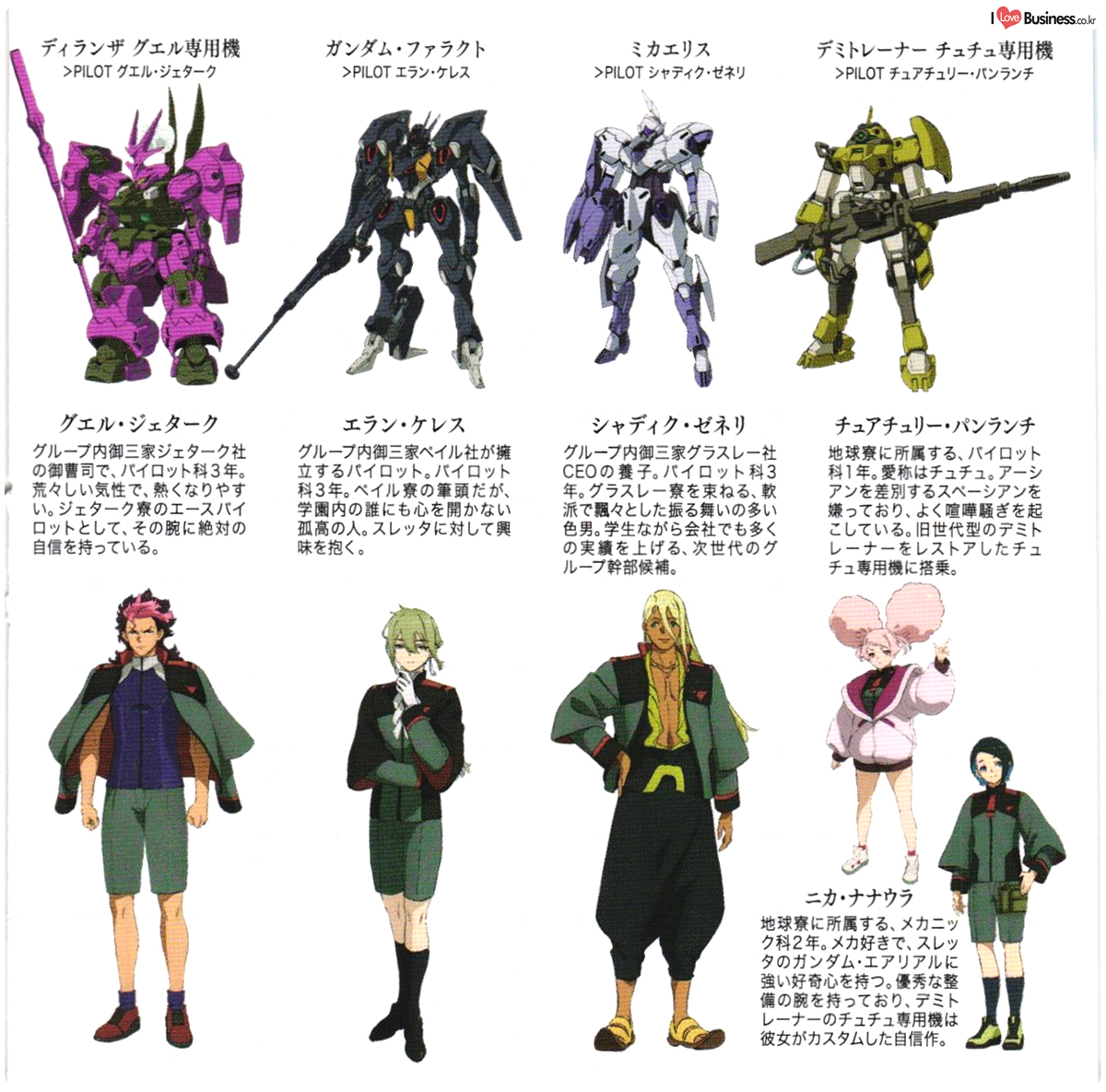 - Mobile Suits from various Gundam series (e.g. Mobile Suit Gundam, Gundam SEED, Gundam 00, Iron-Blooded Orphans)