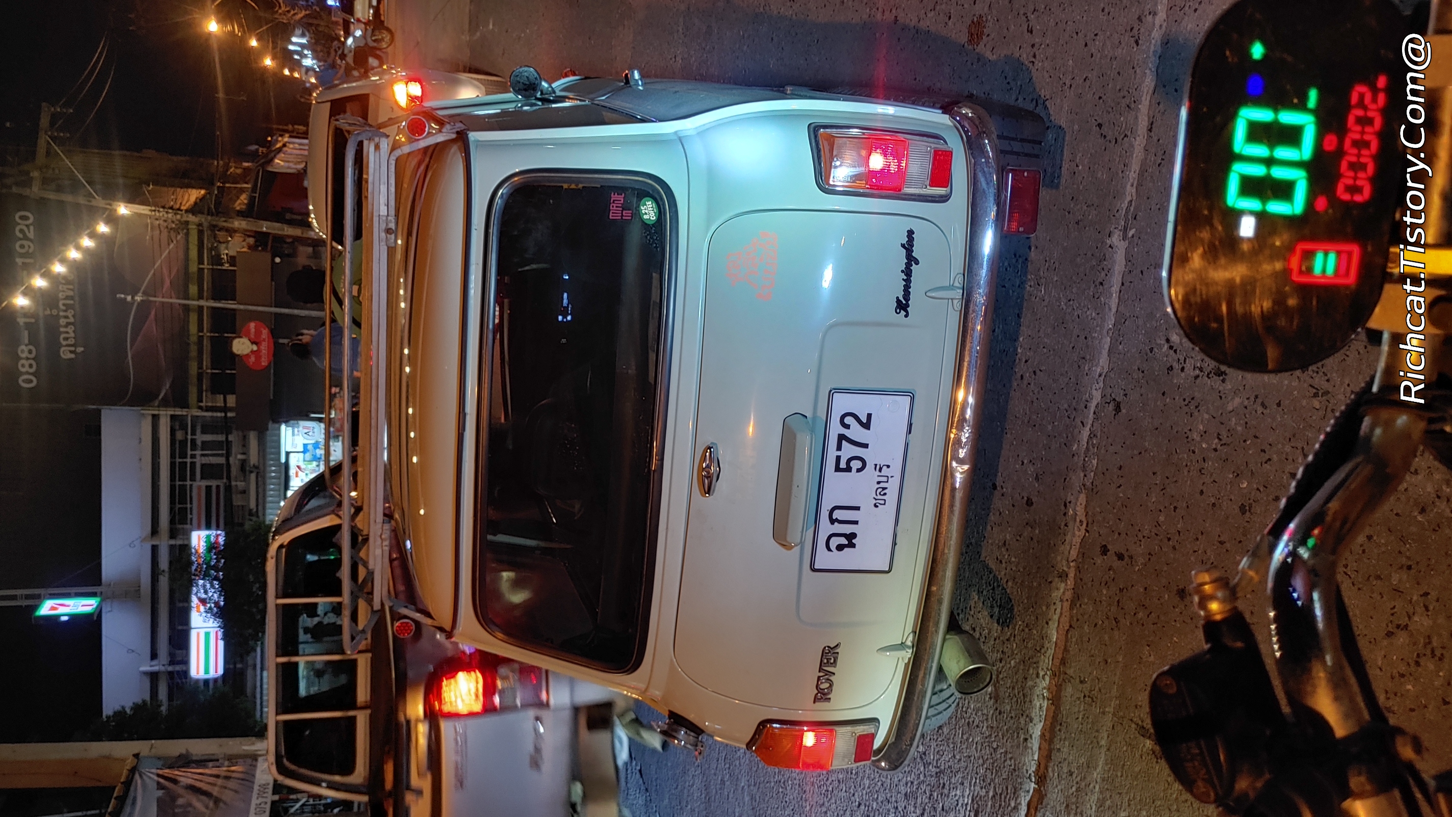 - 태국 번호판: 차량 후면에 부착된 번호판은 태국 번호판입니다. "ฉค 572" 와 아래 "ชลบุรี (촌부리)" 가 적혀 있으며, 이는 이 차량이 태국 촌부리(Chonburi) 지방에 등록되어 있음을 나타냅니다. 클래식 미니는 태국에서도 많은 자동차 애호가들에게 사랑받는 모델입니다.